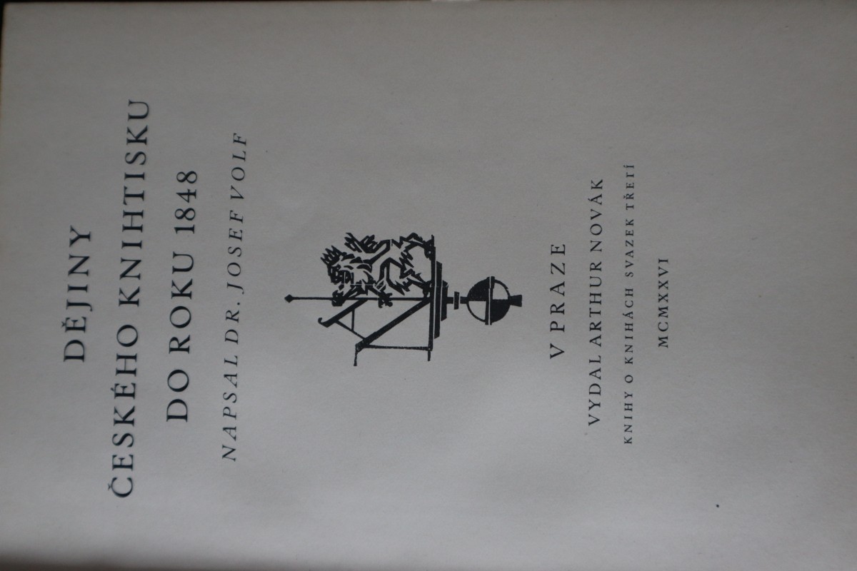 Digitalizovaná tiráž: | DĚJINY ČESKÉHO KNIHTISKU DO ROKU 1848 NAPSAL DR. JOSEF VOLF V PRAZE VYDAL ARTHUR NOVÁK KNIHY O KNIHÁCH SVAZEK TŘETÍ MCMXXVI |