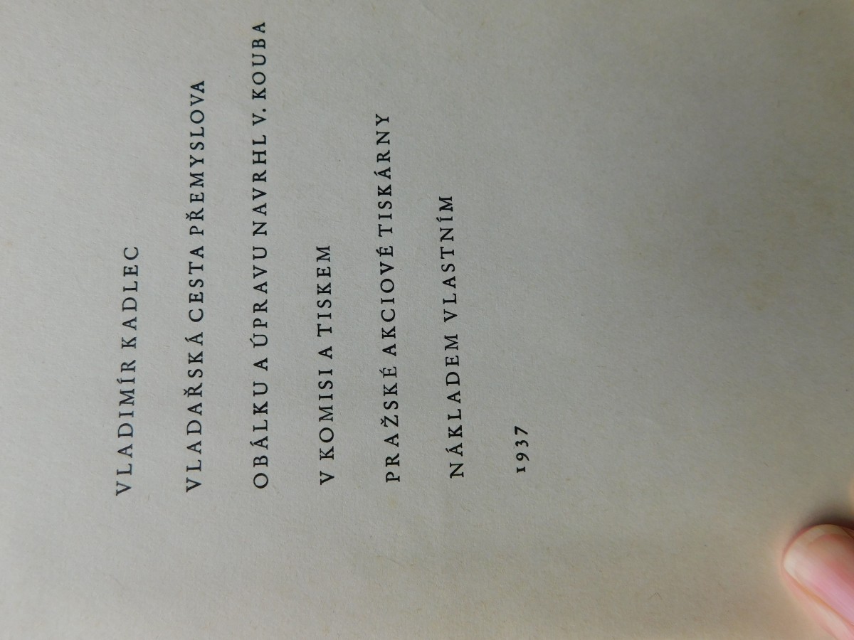 | Digitalizovaná tiráž: | VLADIMÍR KADLEC VLADAŘSKÁ CESTA PŘEMYSLOVA OBÁLKU A ÚPRAVU NAVRHL V. KOUBA V KOMISI A TISKEM PRAŽSKÉ AKCIOVÉ TISKÁRNY NÁKLADEM VLASTNÍM 1937 |