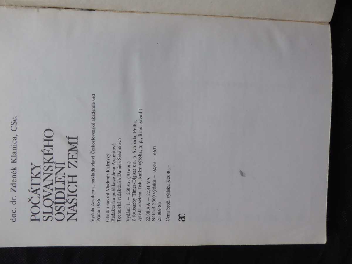 | Digitalizovaná tiráž: | doc. dr. Zdeněk Klanica, CSc. POČÁTKY SLOVANSKÉHO OSÍDLENÍ NAŠICH ZEMÍ Vydala Academia, nakladatelství Československé akademie věd Praha 1986 Obálku navrhl Vladimír Kalenský Redaktorka publikace Jana Axamitová Technická redaktorka Daniela Šebánková Vydání 1.260 str. (70 obr.) Z fotosazby Times-Digiset z n. p. Svoboda, Praha, vytiskl ofsetem Tisk, knižní výroba, n. p., Brno, závod 1 22,08 AA 22,41 VA Náklad 2300 výtisků - 02/63-6637 21-069-86 Cena brož. výtisku Kčs 40,- æ |