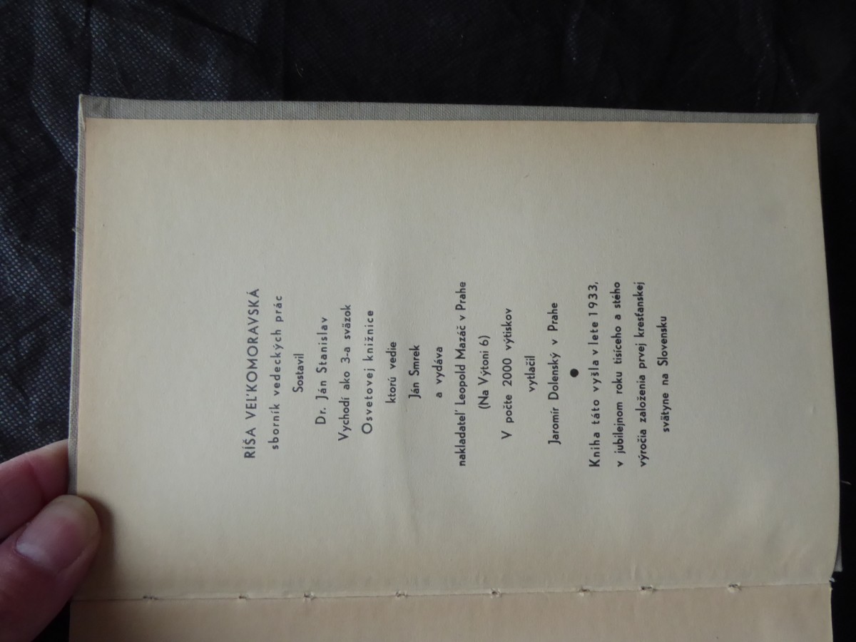 | Digitalizovaná tiráž: | RIŠA VEL'KOMORAVSKÁ sborník vedeckých prác Sostavil Dr. Ján Stanislav Vychodí ako 3-a sväzok Osvetovej knižnice ktorú vedie Ján Smrek a vydáva nakladatel' Leopold Mazáč v Prahe (Na Výtoni 6) V počte 2000 výtiskov vytlačil Jaromír Dolenský v Prahe • Kniha táto vyšla v lete 1933, v jubilejnom roku tisíceho a stého výročia založenia prvej kresťanskej svätyne na Slovensku |