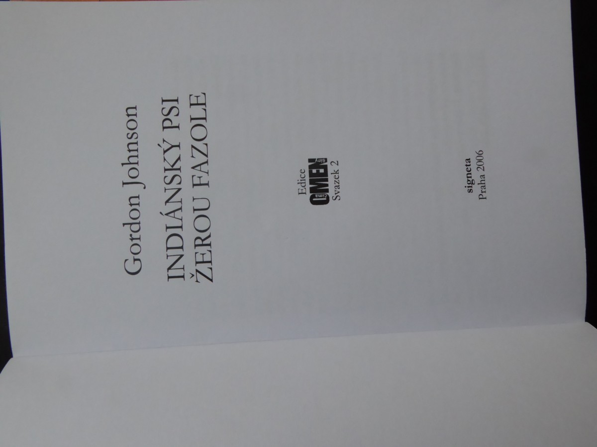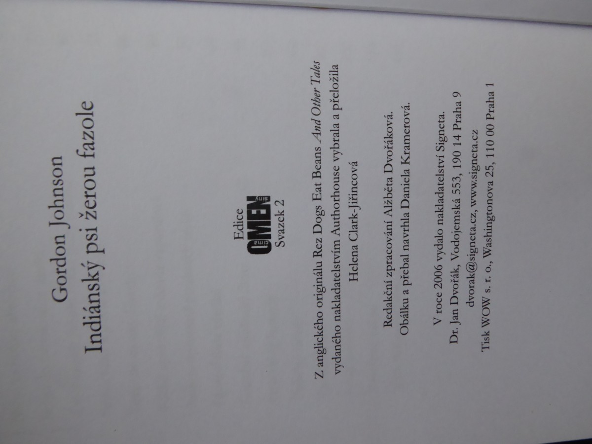 | Digitalizovaná tiráž: | Gordon Johnson Indiánský psi žerou fazole Edice CMEN Svazek 2 Z anglického originálu Rez Dogs Eat Beans And Other Tales vydaného nakladatelstvím Authorhouse vybrala a přeložila Helena Clark-Jiřincová Redakční zpracování Alžběta Dvořáková. Obálku a přebal navrhla Daniela Kramerová. V roce 2006 vydalo nakladatelství Signeta. Dr. Jan Dvořák, Vodojemská 553, 190 14 Praha 9 dvorak@signeta.cz, www.signeta.cz Tisk WOW s. r. o., Washingtonova 25, 110 00 Praha 1 |