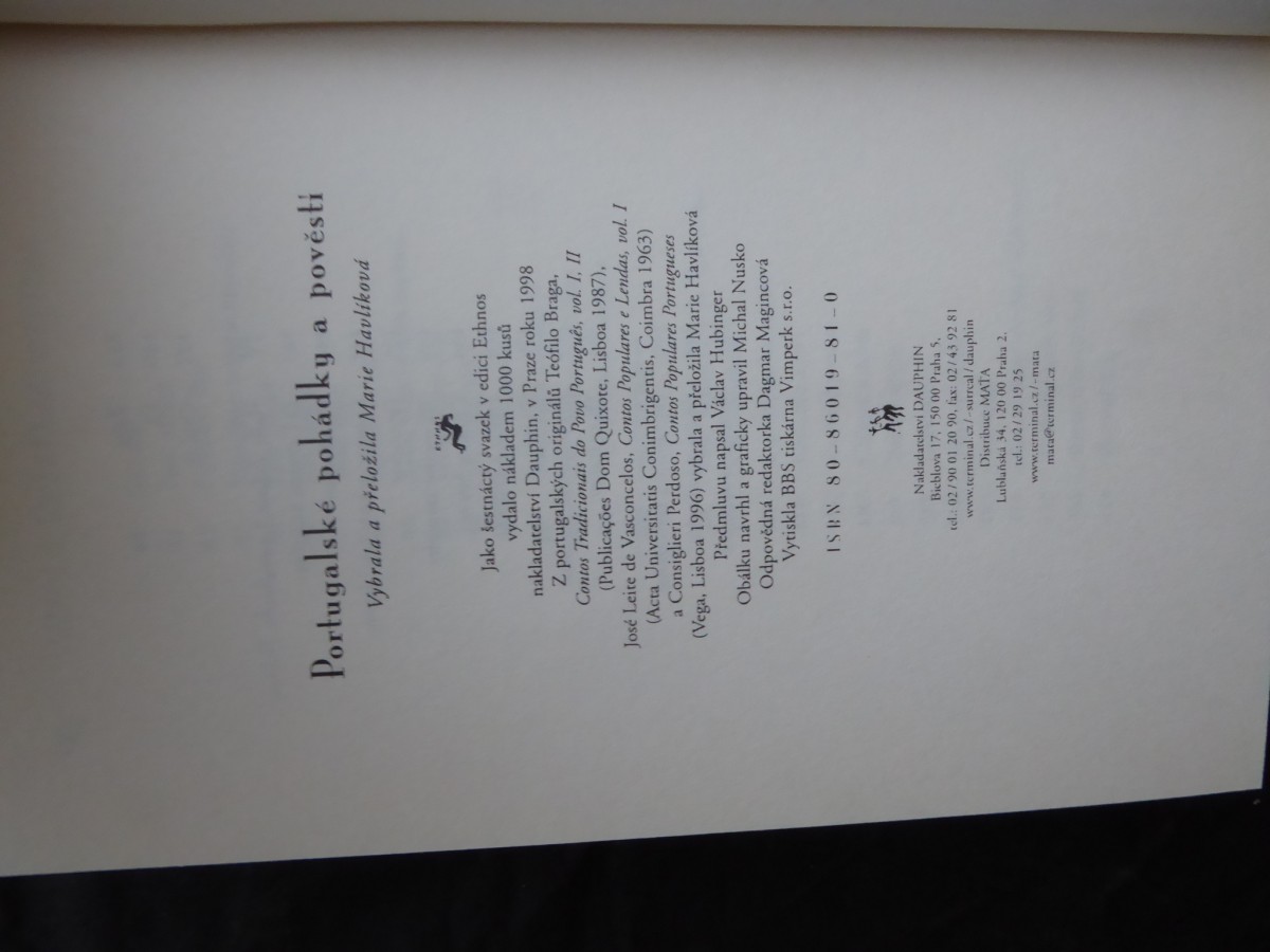 | Digitalizovaná tiráž: | Portugalské pohádky a pověsti Vybrala a přeložila Marie Havlíková Jako šestnáctý svazek v edici Ethnos vydalo nákladem 1000 kusů nakladatelství Dauphin, v Praze roku 1998 Z portugalských originálů Teófilo Braga, Contos Tradicionais do Povo Português, vol. I, II (Publicações Dom Quixote, Lisboa 1987), José Leite de Vasconcelos, Contos Populares e Lendas, vol. I (Acta Universitatis Conimbrigentis, Coimbra 1963) a Consiglieri Perdoso, Contos Populares Portugueses (Vega, Lisboa 1996) vybrala a přeložila Marie Havlíková Předmluvu napsal Václav Hubinger Obálku navrhl a graficky upravil Michal Nusko Odpovědná redaktorka Dagmar Magincová Vytiskla BBS tiskárna Vimperk s.r.o. ISBN 80-86019-81-0 *6* 137 Nakladatelství DAUPHIN Bieblova 17, 150 00 Praha 5. tel.: 02/90 01 20 90, fax: 02/43 92 81 www.terminal.cz/-surreal/dauphin Distribuce MATA Lublaňská 34, 120 00 Praha 2. tel.: 02/29 19 25 www.terminal.cz/-mata mara@terminal.cz |