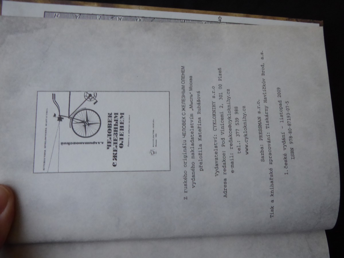 | Digitalizovaná tiráž: | A.XApumлNoackuů ЧЕЛОВЕК С ЖЕЛЕЗНЫМ O.JEHEM Z ruského originálu ЧЕЛОВЕК С ЖЕЛЕЗНЫМ ОЛЕНЕМ vydaného nakladatelstvím „Мысль Москва přeložila Kateřina Rubášová Vydavatelství: CYKLOKNIHY s.r.o Adresa redakce: Pod Vinicemi 2, 301 00 Plzeň e-mail: redakce@cykloknihy.cz tel.: 377 539 988 www.cykloknihy.cz Sazba: PRESSMAN s.r.o. Tisk a knihařské zpracování: Tiskárny Havlíčkův Brod, a.s. 1. české vydání - listopad 2009 ISBN 978-80-87193-07-5 40 |