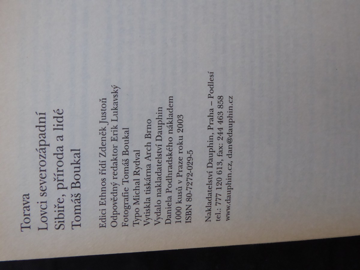 | Digitalizovaná tiráž: | Torava Lovci severozápadní Sibiře, příroda a lidé Tomáš Boukal Edici Ethnos řídí Zdeněk Justoň Odpovědný redaktor Erik Lukavský Fotografie Tomáš Boukal Typo Michal Rydval Vytiskla tiskárna Arch Brno Vydalo nakladatelství Dauphin Daniela Podhradského nákladem 1000 kusů v Praze roku 2003 ISBN 80-7272-029-5 Nakladatelství Dauphin, Praha - Podlesí tel.: 777 120 613, fax: 244 463 858 www.dauphin.cz, dan@dauphin.cz |