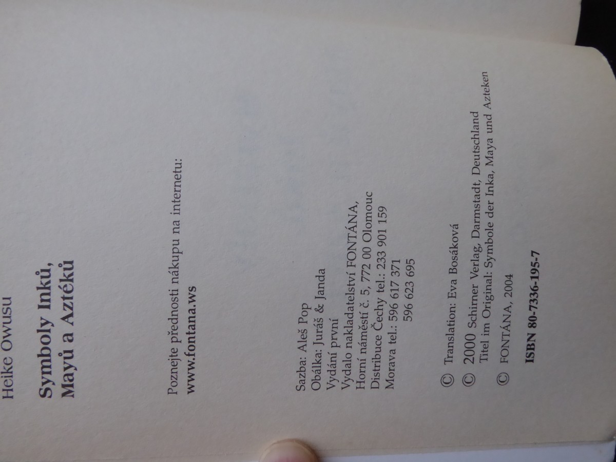 | Digitalizovaná tiráž: | Heike Owusu Symboly Inků, Mayů a Aztéků Poznejte přednosti nákupu na internetu: www.fontana.ws Sazba: Aleš Pop Obálka: Juráš & Janda Vydání první Vydalo nakladatelství FONTÁNA, Horní náměstí č. 5, 772 00 Olomouc Distribuce Čechy tel.: 233 901 159 Morava tel.: 596 617 371 596 623 695 Translation: Eva Bosáková 2000 Schirner Verlag, Darmstadt, Deutschland Titel im Original: Symbole der Inka, Maya und Azteken FONTÁNA, 2004 ISBN 80-7336-195-7 |