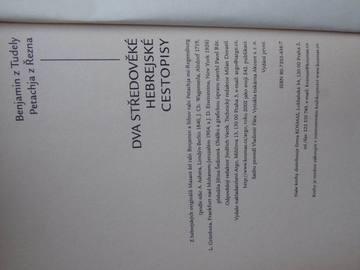 | Digitalizovaná tiráž: | Benjamin z Tudely Petachja z Řezna DVA STŘEDOVĚKÉ HEBREJSKÉ CESTOPISY Z hebrejských originálů Masaot šel rabi Binjamin a Sibuv rabi Petachja mi-Regensburg (podle edic A. Ashera, Londýn-Berlín 1840, J. Ch. Wagenseila, Altdorf 1719, L. Grünhuta, Frankfurt nad Mohanem-Jeruzalém 1904, a J. D. Eisensteina, New York 1926) přeložila Jiřina Šedinová. Obálku a grafickou úpravu navrhl Pavel Rut. Odpovědný redaktor Jindřich Vacek. Technický redaktor Milan Dorazil. Vydalo nakladatelství Argo, Milíčova 13, 130 00 Praha 3, e-mail: argo@iargo.cz, http://www.kosmas.cz/argo, roku 2002 jako svoji 542. publikaci. Sazbu provedl Vladimír Fára. Vytiskla tiskárna Akcent s. r. o. Vydání první. ISBN 80-7203-436-7 Naše knihy distribuuje firma KOSMAS, Lublaňská 34, 120 00 Praha 2, tel./fax: 222 510 749, e-mail: kosmas@kosmas.cz Knihy je možno zakoupit v internetovém knihkupectví www.kosmas.cz. |