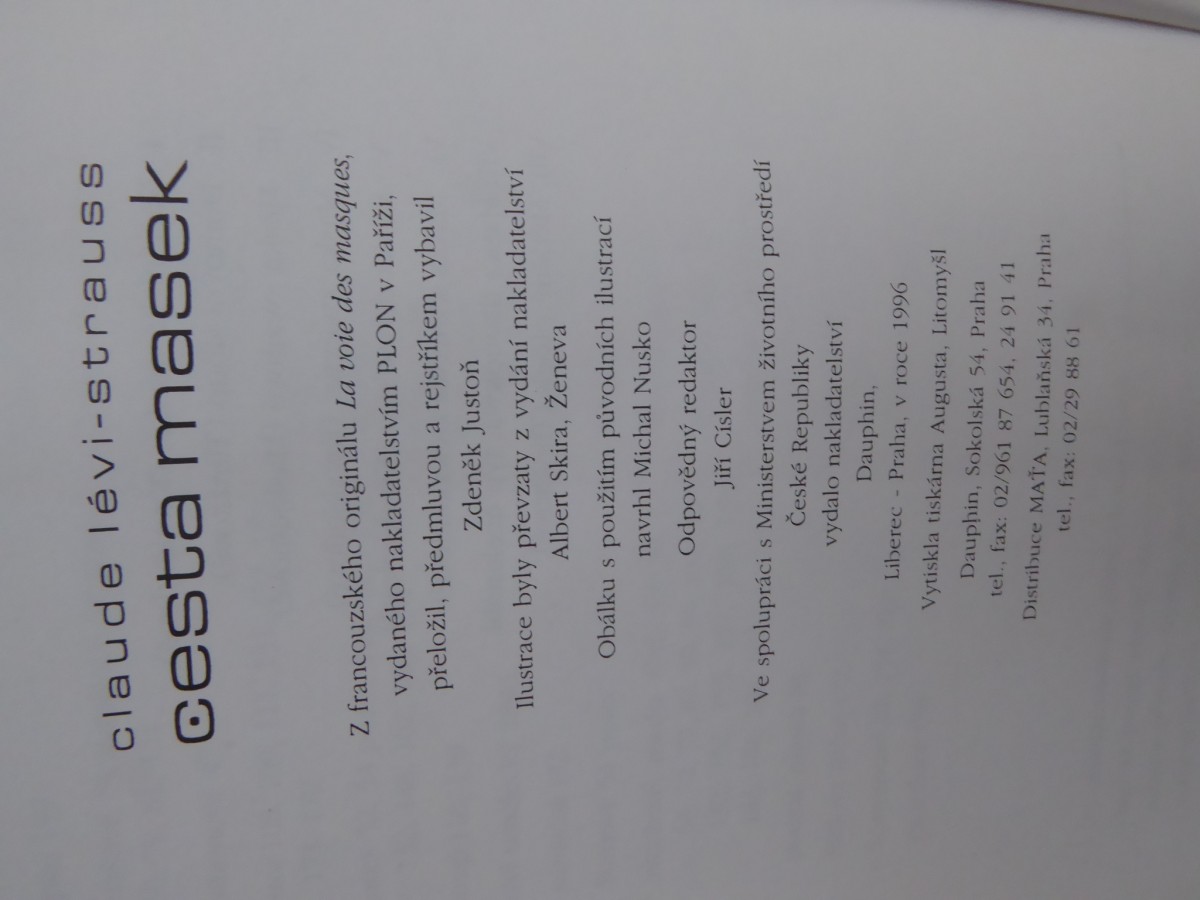 | Digitalizovaná tiráž: | claude lévi-strauss cesta masek Z francouzského originálu La voie des masques, vydaného nakladatelstvím PLON v Paříži, přeložil, předmluvou a rejstříkem vybavil Zdeněk Justoň Ilustrace byly převzaty z vydání nakladatelství Albert Skira, Ženeva Obálku s použitím původních ilustrací navrhl Michal Nusko Odpovědný redaktor Jiří Císler Ve spolupráci s Ministerstvem životního prostředí České Republiky vydalo nakladatelství Dauphin, Liberec - Praha, v roce 1996 Vytiskla tiskárna Augusta, Litomyšl Dauphin, Sokolská 54, Praha tel., fax: 02/961 87 654, 24 91 41 Distribuce MATA, Lublaňská 34, Praha tel., fax: 02/29 88 61 |