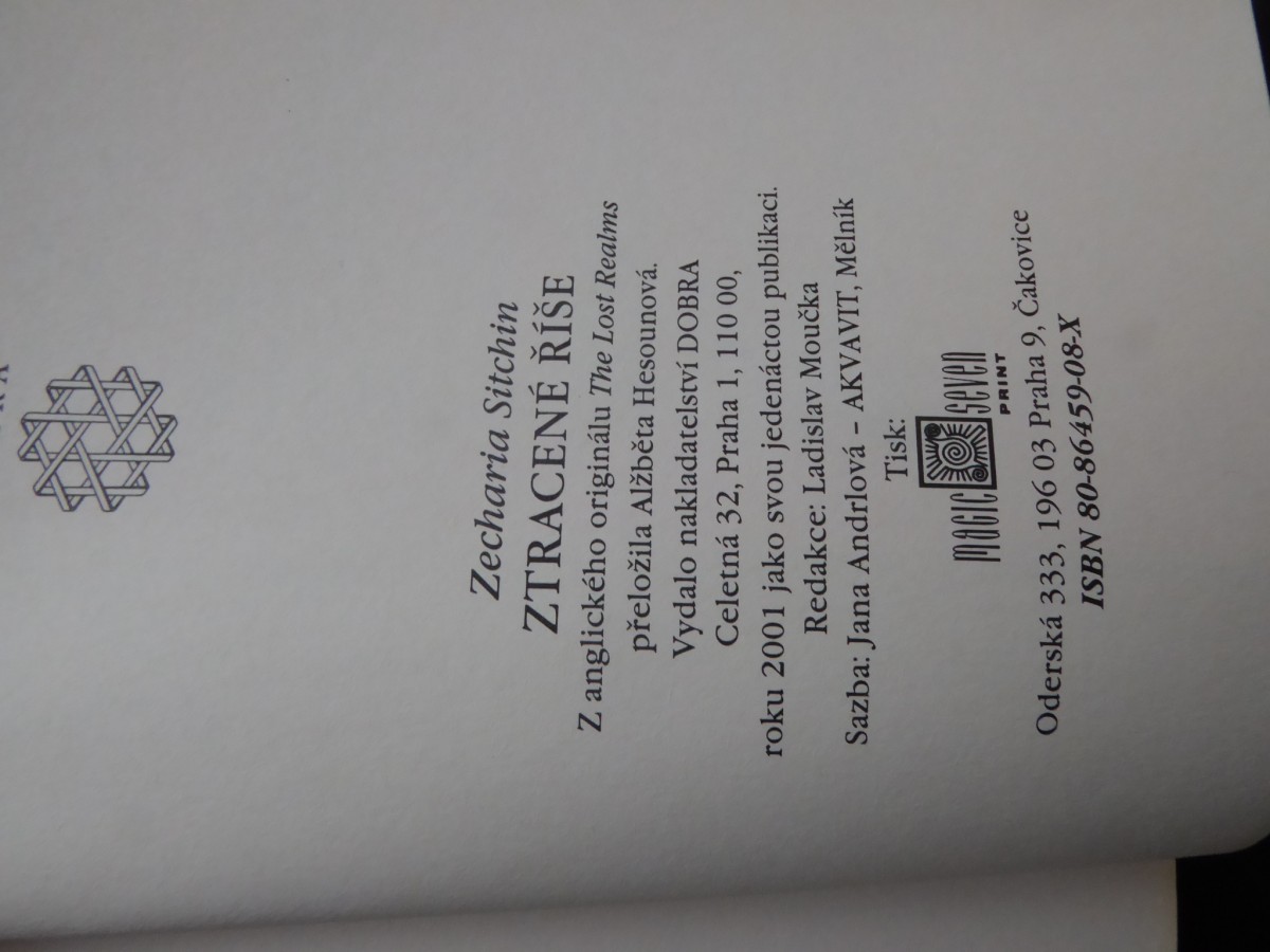 | Digitalizovaná tiráž: | Zecharia Sitchin ZTRACENÉ ŘÍŠE Z anglického originálu The Lost Realms přeložila Alžběta Hesounová. Vydalo nakladatelství DOBRA Celetná 32, Praha 1, 110 00, roku 2001 jako svou jedenáctou publikaci. Redakce: Ladislav Moučka Sazba: Jana Andrlová - AKVAVIT, Mělník Tisk: MagicSeven PRINT Oderská 333, 196 03 Praha 9, Čakovice ISBN 80-86459-08-X |