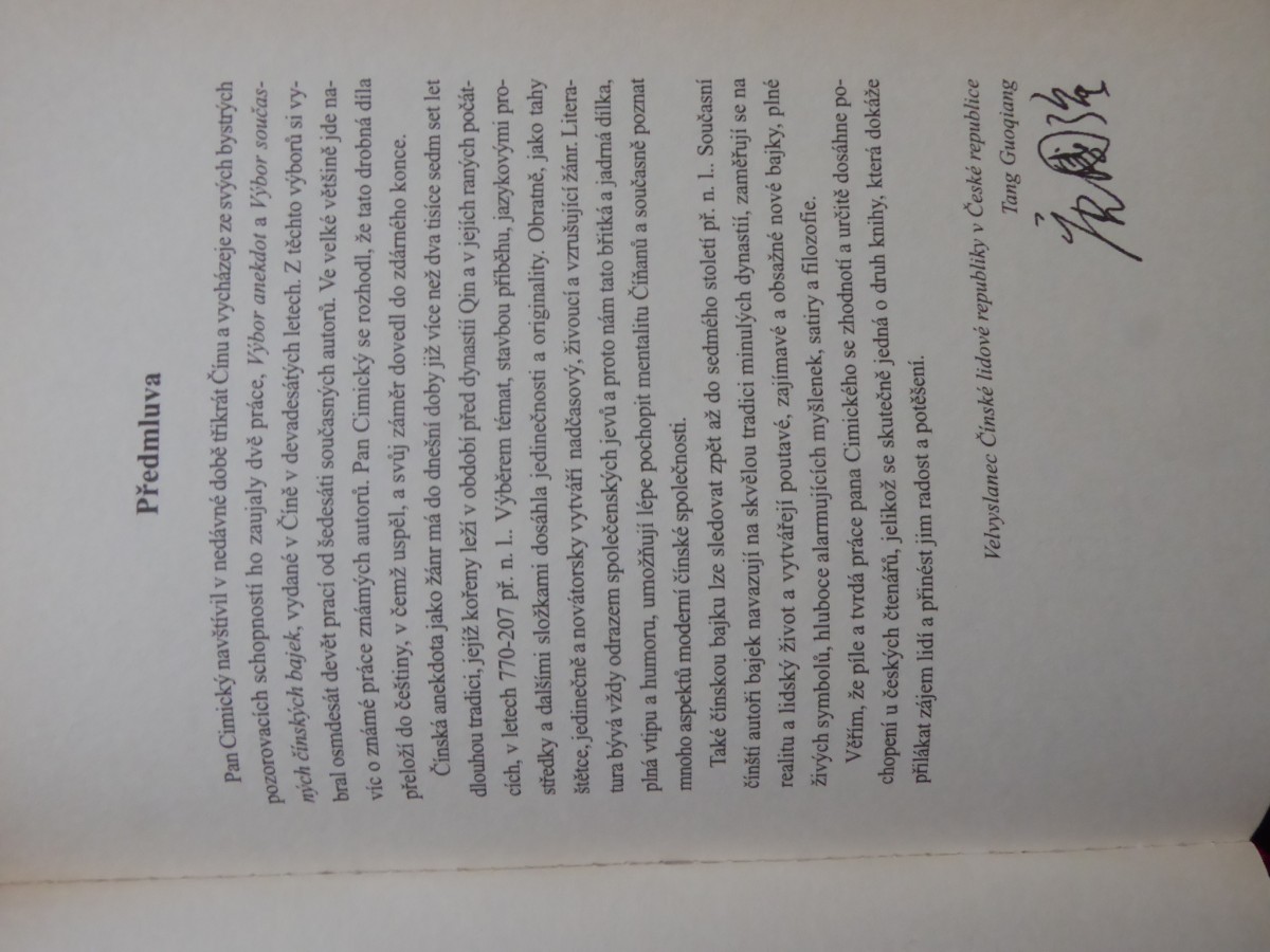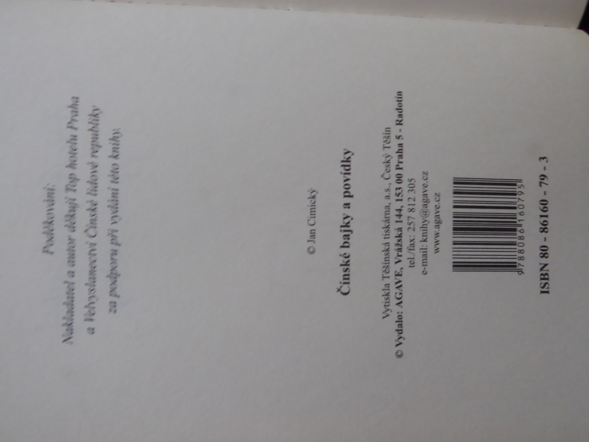 | Digitalizovaná tiráž: | Poděkováni: Nakladatel a autor děkuji Top hotelu Praha a Velvyslanectvi Činské lidové republiky za podporu při vydání této knihy Jan Cimický Čínské bajky a povídky Vytiskla Těšínská tiskárna, a.s., Český Těšín Vydalo: AGAVE, Vrážská 144, 153 00 Praha 5 - Radotín tel./fax: 257 812 305 e-mail: knihy@agave.cz www.agave.cz g1788086 160795 ISBN 80-86160-79-3 |