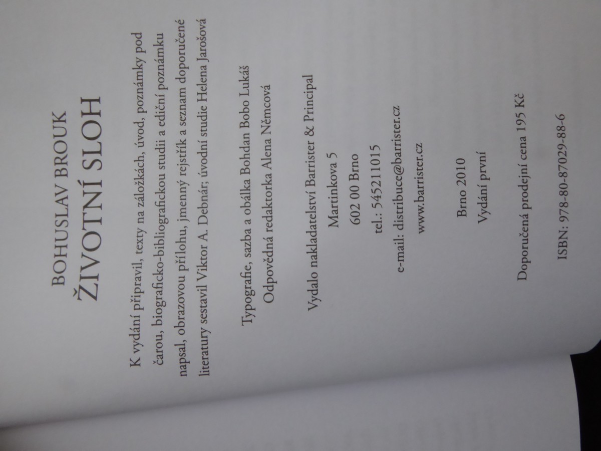| Digitalizovaná tiráž: | BOHUSLAV BROUK ŽIVOTNÍ SLOH K vydání připravil, texty na záložkách, úvod, poznámky pod čarou, biograficko-bibliografickou studii a ediční poznámku napsal, obrazovou přílohu, jmenný rejstřík a seznam doporučené literatury sestavil Viktor A. Debnár; úvodní studie Helena Jarošová Typografie, sazba a obálka Bohdan Bobo Lukáš Odpovědná redaktorka Alena Němcová Vydalo nakladatelství Barrister & Principal Martinkova 5 602 00 Brno tel.: 545211015 e-mail: distribuce@barrister.cz www.barrister.cz Brno 2010 Vydání první Doporučená prodejní cena 195 Kč ISBN: 978-80-87029-88-6 |