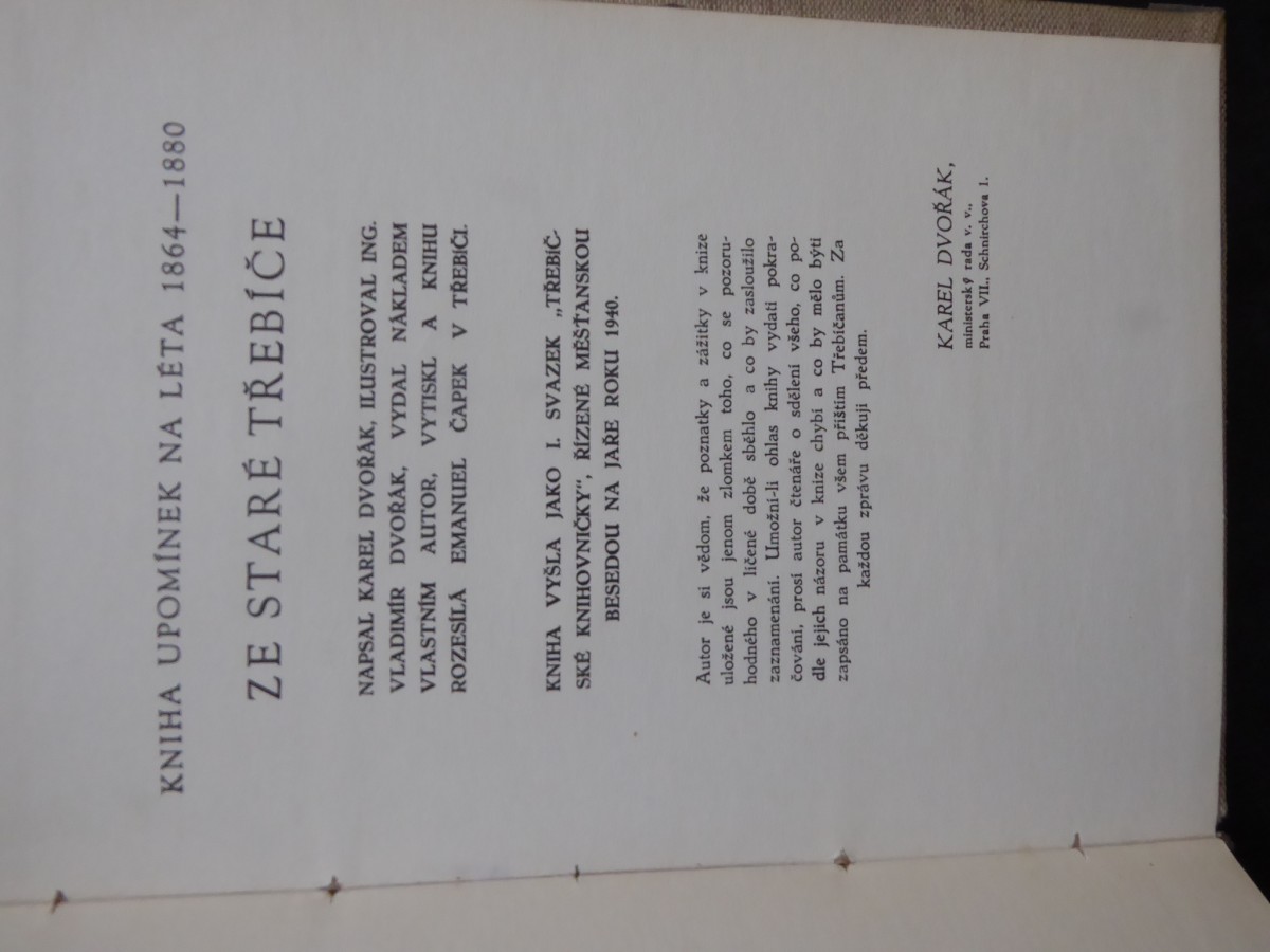 | Digitalizovaná tiráž: | KNIHA UPOMÍNEK NA LÉTA 1864-1880 ZE STARÉ TŘEBÍČE NAPSAL KAREL DVOŘÁK, ILUSTROVAL ING. VLADIMÍR DVOŘÁK, VYDAL NÁKLADEM VLASTNÍM AUTOR, VYTISKL A KNIHU ROZESÍLÁ EMANUEL ČAPEK V TŘEBÍČI. KNIHA VYŠLA JAKO I. SVAZEK „TŘEBÍČ SKÉ KNIHOVNIČKY", ŘÍZENÉ MĚŠŤANSKOU BESEDOU NA JAŘE ROKU 1940. Autor je si vědom, že poznatky a zážitky v knize uložené jsou jenom zlomkem toho, co se pozoru- hodného v líčené době sběhlo a co by zasloužilo zaznamenání. Umožní-li ohlas knihy vydati pokra- čování, prosí autor čtenáře o sdělení všeho, co po- dle jejich názoru v knize chybí a co by mělo býti zapsáno na památku všem příštím Třebíčanům. Za každou zprávu děkuji předem. KAREL DVOŘÁK, ministerský rada v. v.. Praha VII., Schnirchova 1. |