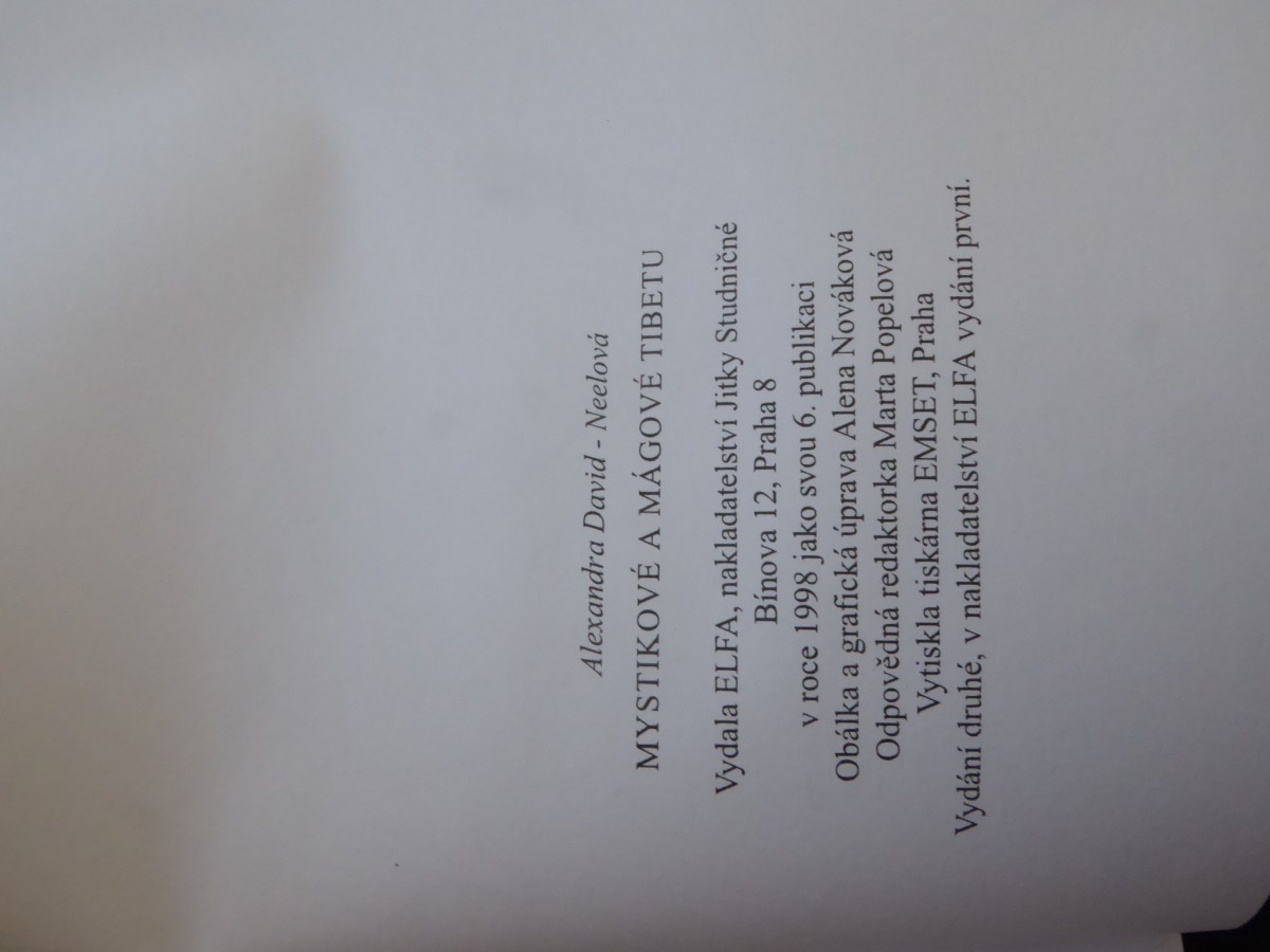 | Digitalizovaná tiráž: | Alexandra David-Neelová MYSTIKOVÉ A MÁGOVÉ TIBETU Vydala ELFA, nakladatelství Jitky Studničné Bínova 12, Praha 8 v roce 1998 jako svou 6. publikaci Obálka a grafická úprava Alena Nováková Odpovědná redaktorka Marta Popelová Vytiskla tiskárna EMSET, Praha Vydání druhé, v nakladatelství ELFA vydání první. |