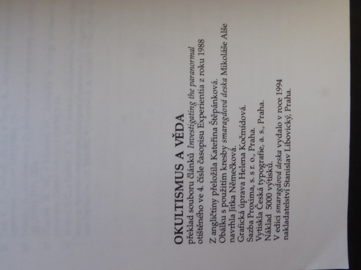 | Digitalizovaná tiráž: | OKULTISMUS A VĚDA překlad souboru článků Investigating the paranormal otištěného ve 4. čísle časopisu Experientia z roku 1988 Z angličtiny přeložila Kateřina Štěpánková. Obálku s použitím kresby smaragdová deska Mikoláše Alše navrhla Jitka Němečková. Grafická úprava Helena Kočmídová. Sazba Proxima, s. s r. o., Praha. Vytiskla Česká typografie, a. s., Praha. Náklad 5000 výtisků. Vedici smaragdová deska vydalo v roce 1994 nakladatelství Stanislav Libovický, Praha. |