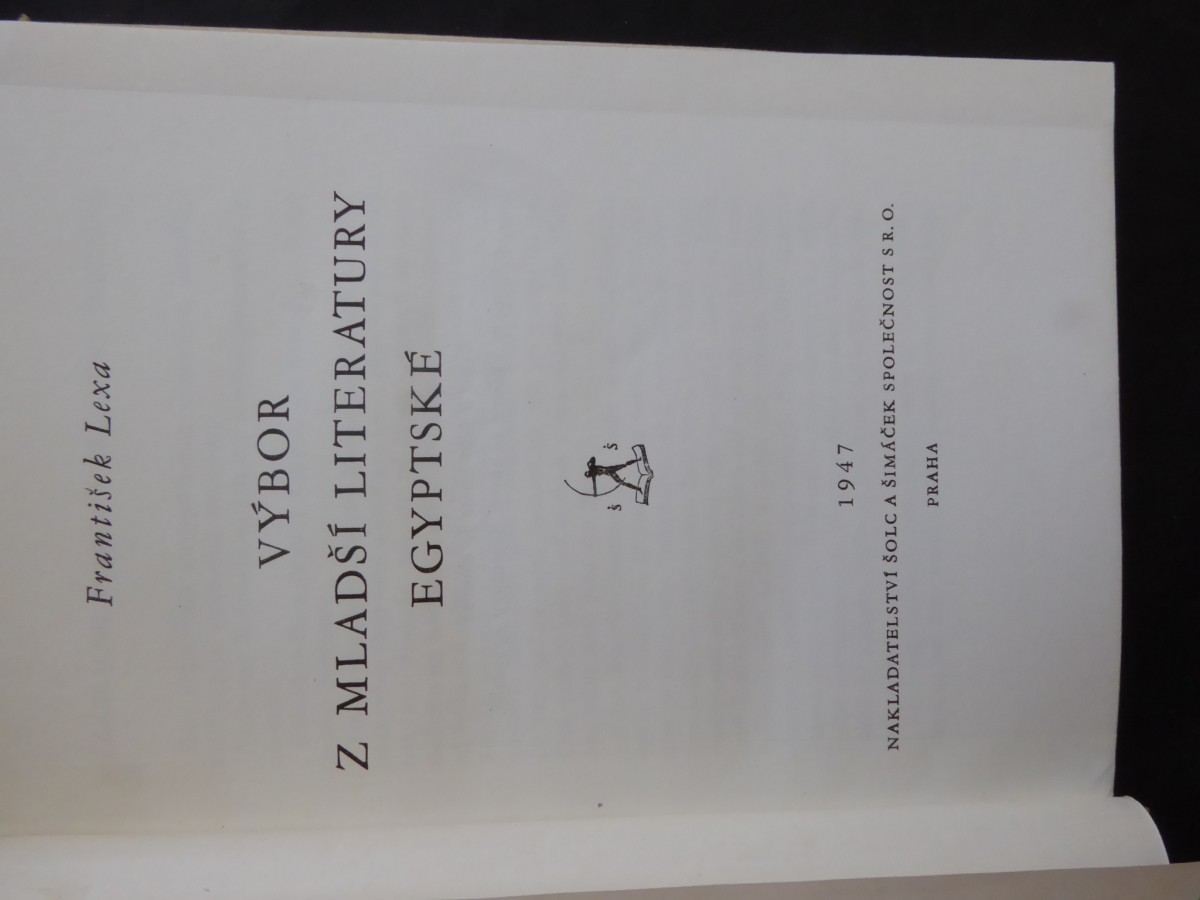 | Digitalizovaná tiráž: | František Lexa VÝBOR Z MLADŠÍ LITERATURY EGYPTSKE 1947 NAKLADATELSTVÍ ŠOLC A ŠIMÁČEK SPOLEČNOST S R. O. PRAHA |