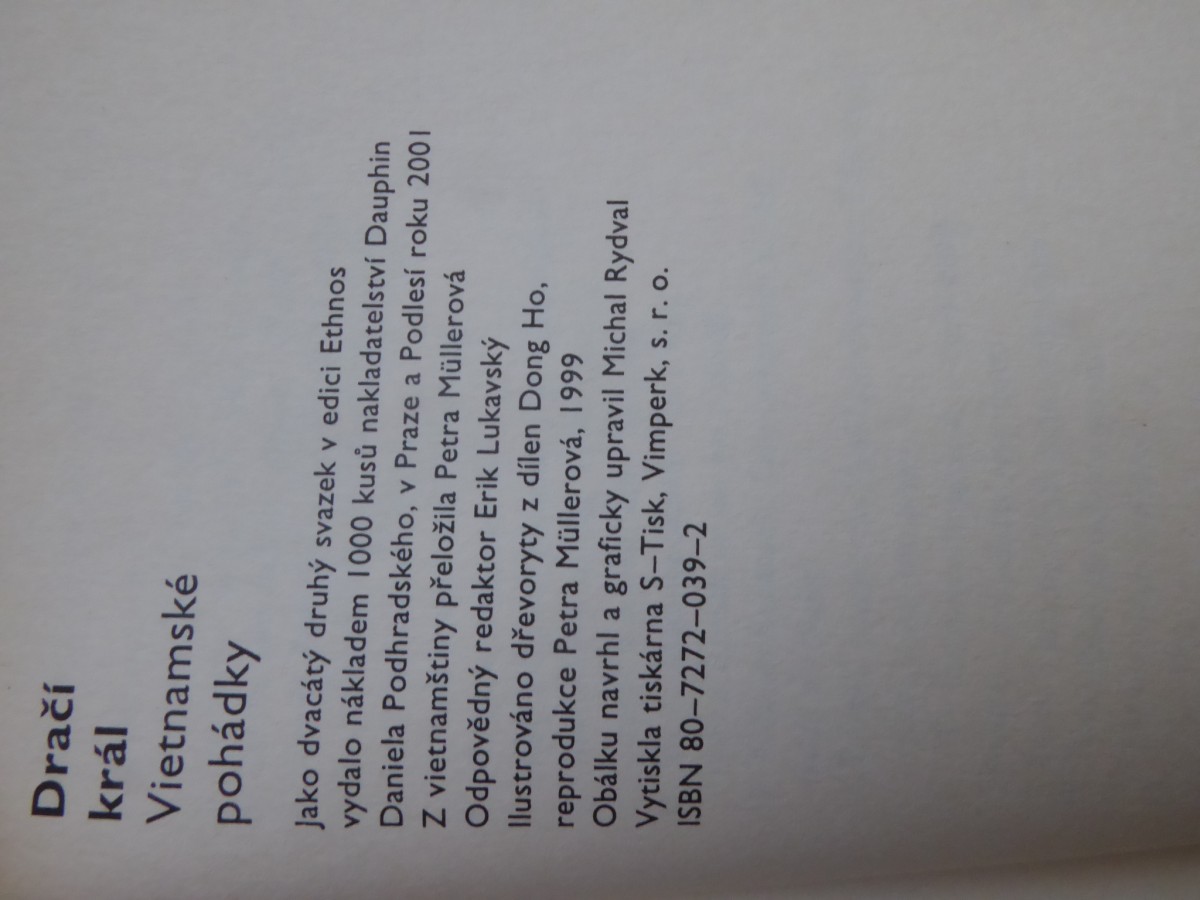 | Digitalizovaná tiráž: | Dračí král Vietnamské pohádky Jako dvacátý druhý svazek v edici Ethnos vydalo nákladem 1000 kusů nakladatelství Dauphin Daniela Podhradského, v Praze a Podlesí roku 2001 Z vietnamštiny přeložila Petra Müllerová Odpovědný redaktor Erik Lukavský Ilustrováno dřevoryty z dílen Dong Ho, reprodukce Petra Müllerová, 1999 Obálku navrhl a graficky upravil Michal Rydval Vytiskla tiskárna S-Tisk, Vimperk, s. r. o. ISBN 80-7272-039-2 |