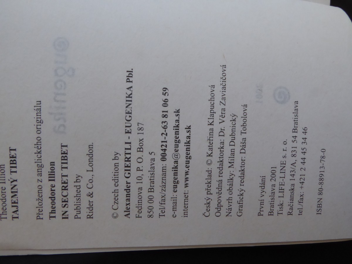 | Digitalizovaná tiráž: | Theodore Illion TAJEMNÝ TIBET Přeloženo z anglického originálu Theodore Illion IN SECRET TIBET Published by Rider & Co., London. © Czech edition by sslinogue Alexander GIERTLI - EUGENIKA Pbl. Fedinova 10, P. O. Box 187 850 00 Bratislava 5 Tel/fax/záznam: 00421-2-63 81 06 59 e-mail: eugenika@eugenika.sk internet: www.eugenika.sk Český překlad: © Kateřina Klapuchová Odpovědná redaktorka: Dr. Věra Zaviačičová Návrh obálky: Milan Dubnický Grafický redaktor: Dáša Tobolová První vydání Bratislava 2001 Tisk: LIFE-LINE s. r. o. 1021 Račianska 143/A, 831 54 Bratislava tel./fax: +421 2 44 45 34 46 ISBN 80-88913-78-0 |