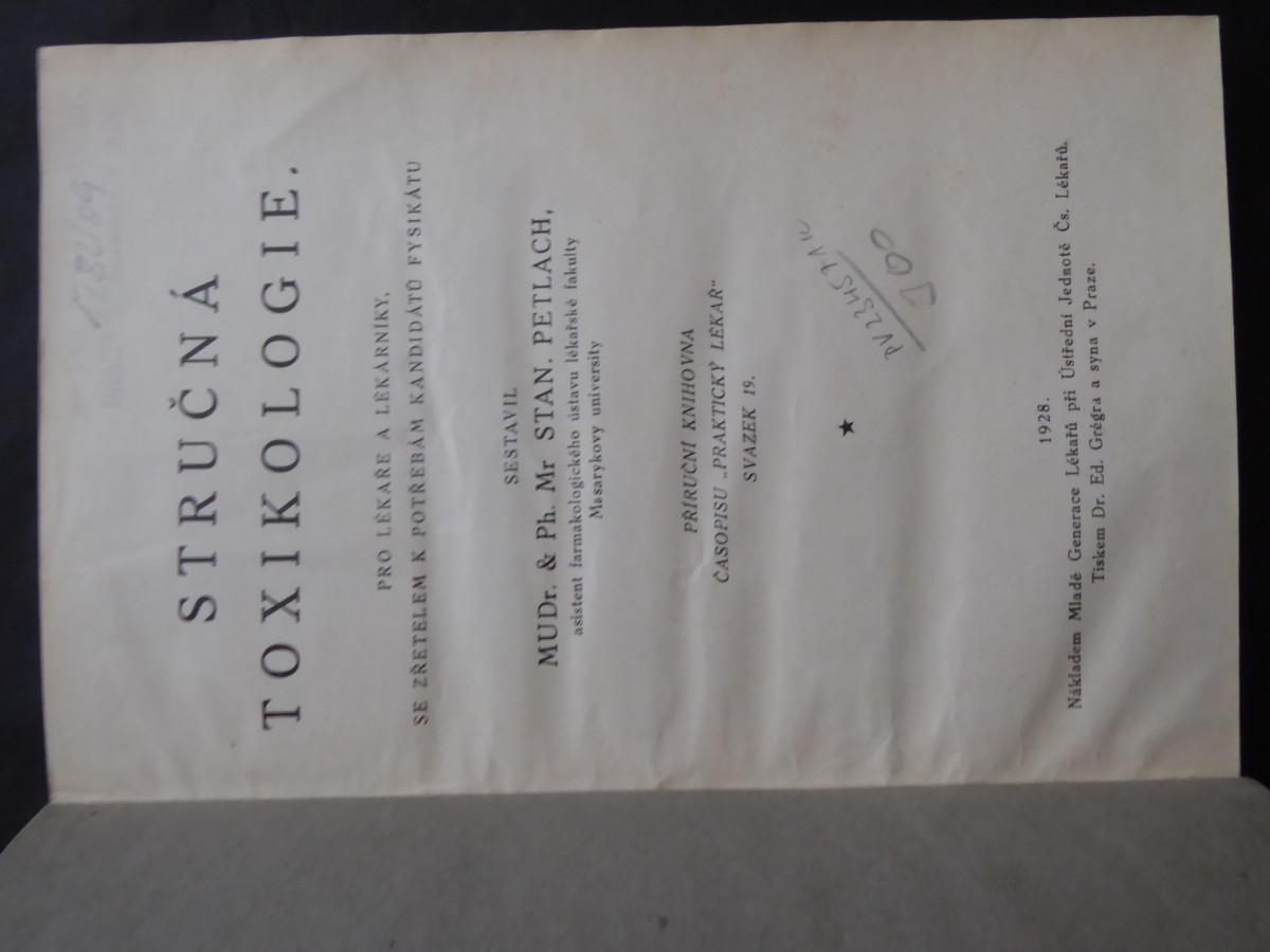 | Digitalizovaná tiráž: | STRUČNÁ TOXIKOLOGIE. PRO LÉKAŘE A LEKARNIKY, SE ZRETELEM K POTREBAM KANDIDATO FYSIKATU SESTAVIL MUDr. & Ph. Mr STAN. PETLACH, asistent farmakologického ústavu lékařské fakulty Masarykovy university PRIRUČNÍ KNIHOVNA ČASOPISU PRAKTICKY LEKAR" SVAZEK 19. PV23457A 1928. Nákladem Mladé Generace Lékařů při Ústřední Jednotě Čs. Lékařů. Tiskem Dr. Ed. Grégra a syna v Praze. |