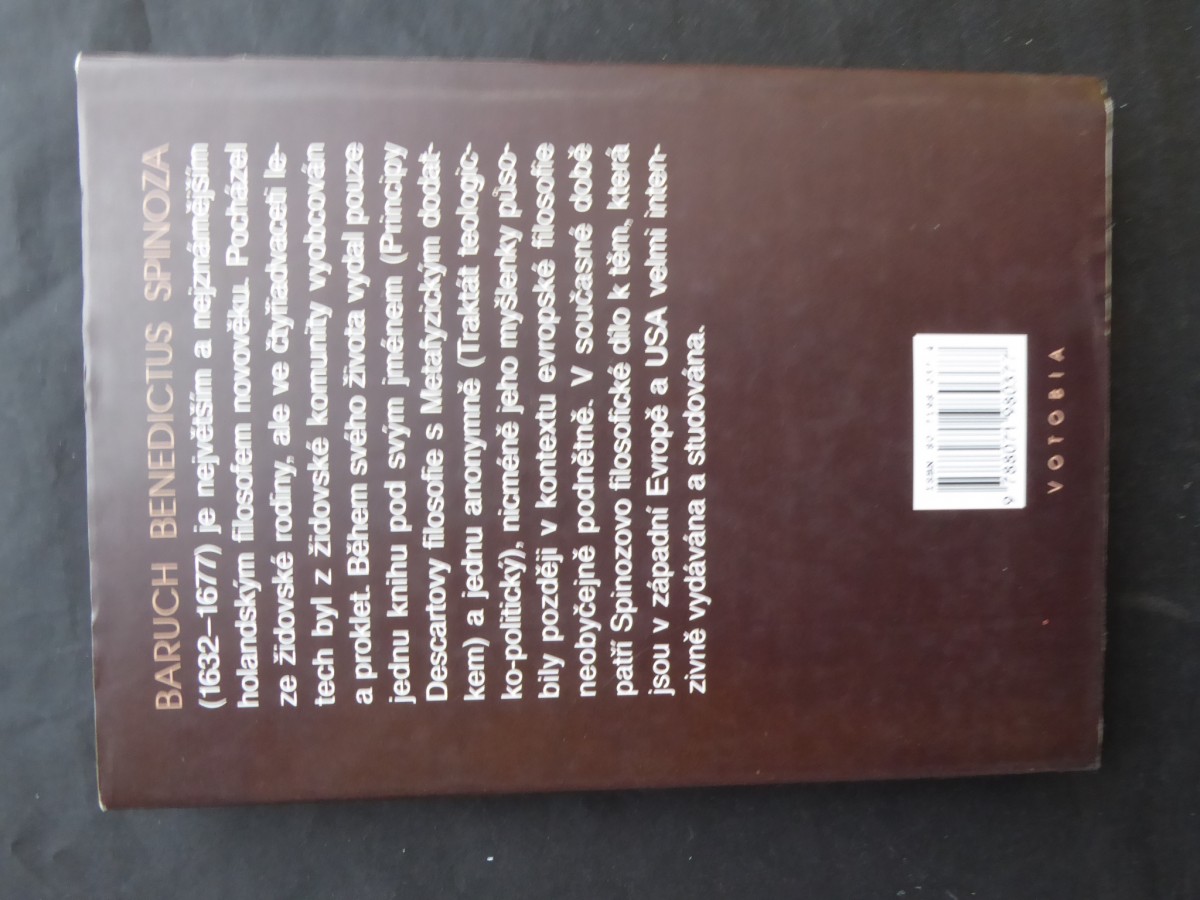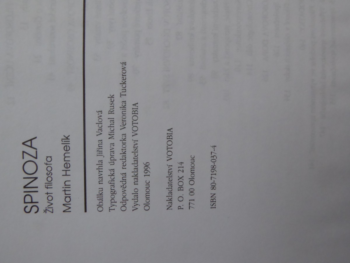 | Digitalizovaná tiráž: | SPINOZA Život filosofa Martin Hemelík Obálku navrhla Jiřina Vaclová Typografická úprava Michal Rusek Odpovědná redaktorka Veronika Tuckerová Vydalo nakladatelství VOTOBIA Olomouc 1996 Nakladatelství VOTOBIA P. O. BOX 214 771 00 Olomouc ISBN 80-7198-037-4 |