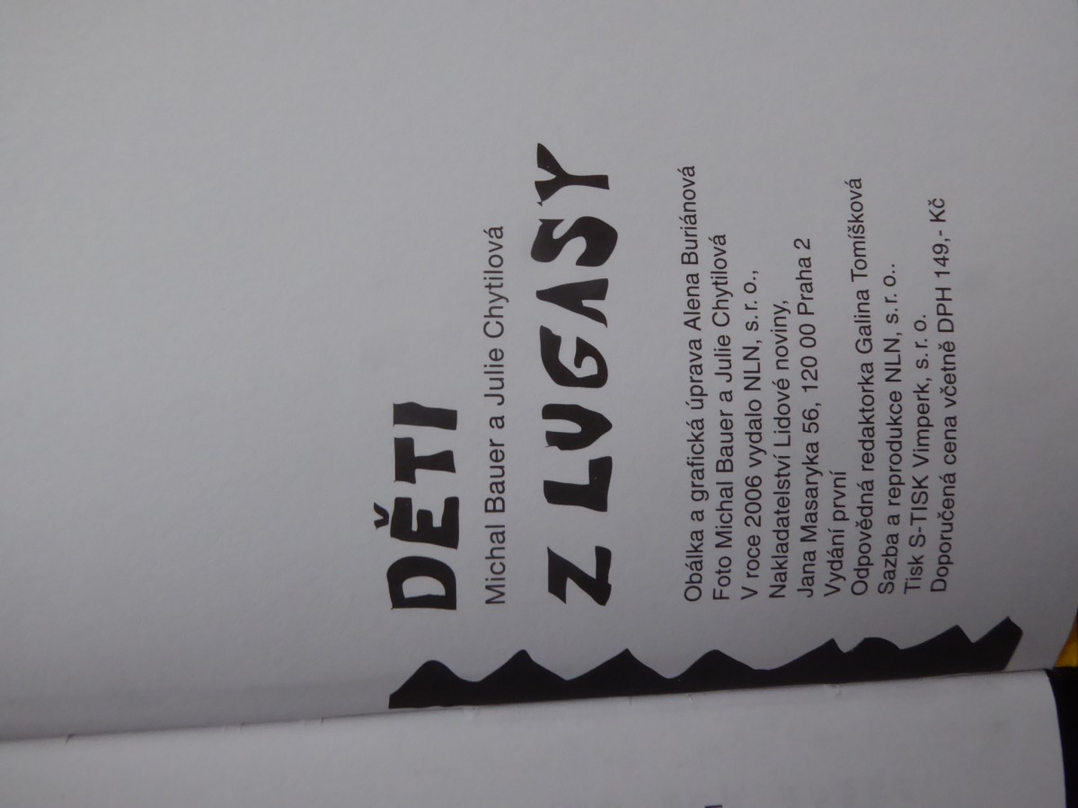 | Digitalizovaná tiráž: | DĚTI Michal Bauer a Julie Chytilová Z LUGASY Obálka a grafická úprava Alena Buriánová Foto Michal Bauer a Julie Chytilová V roce 2006 vydalo NLN, s. r. o., Nakladatelství Lidové noviny, Jana Masaryka 56, 120 00 Praha 2 Vydání první Odpovědná redaktorka Galina Tomíšková Sazba a reprodukce NLN, s. r. o.. Tisk S-TISK Vimperk, s. r. o. Doporučená cena včetně DPH 149,- Kč |