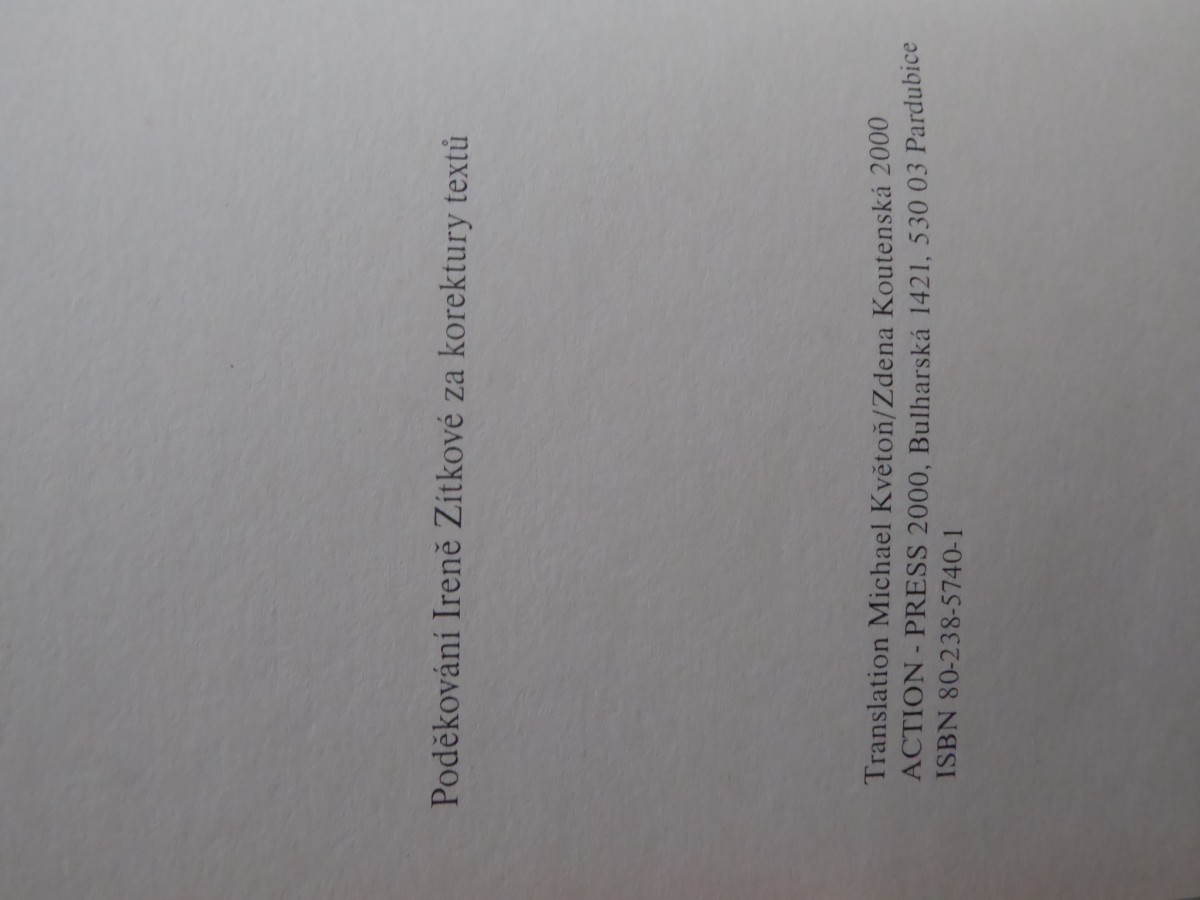 | Digitalizovaná tiráž: | Poděkování Ireně Zítkové za korektury textů Translation Michael Květoň/Zdena Koutenská 2000 ACTION - PRESS 2000, Bulharská 1421, 530 03 Pardubice ISBN 80-238-5740-1 |