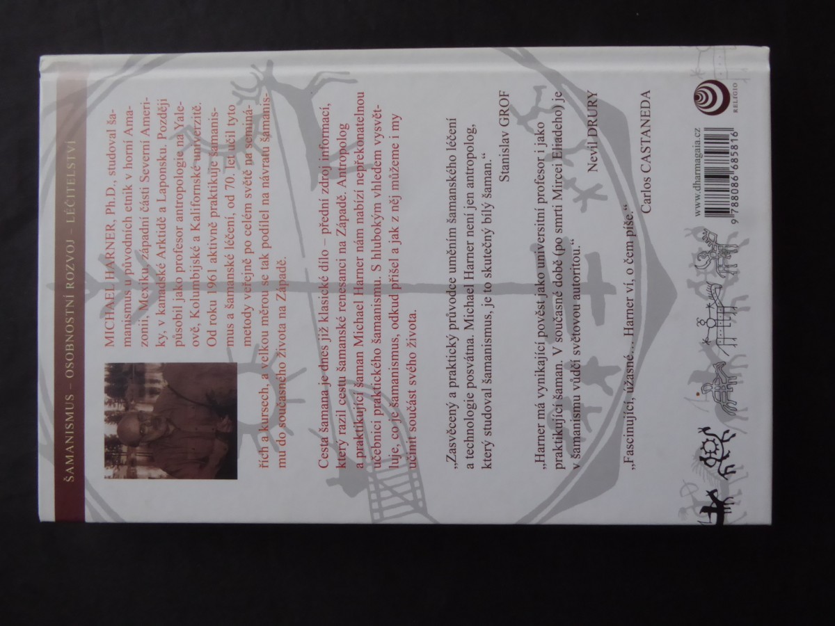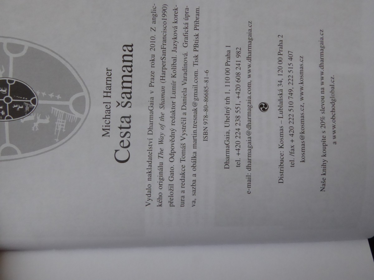 | Digitalizovaná tiráž: | Michael Harner Cesta šamana Vydalo nakladatelství DharmaGaia v Praze roku 2010. Z anglic- kého originálu The Way of the Shaman (HarperSanFrancisco 1990) přeložil Gato. Odpovědný redaktor Lumír Kolíbal. Jazyková korek- tura a redakce Tomáš Vystrčil a Daniela Varadínová. Grafická úpra- va, sazba a obálka martin.tresnak@gmail.com. Tisk PBtisk Příbram. ISBN 978-80-86685-81-6 DharmaGaia, Uhelný trh 1, 110 00 Praha 1 tel. +420 224 238 551, +420 608 241 982 e-mail: dharmagaia@dharmagaia.com, www.dharmagaia.cz Distribuce: Kosmas - Lublaňská 34, 120 00 Praha 2 tel./fax +420 222 510 749, 222 515 407 kosmas@kosmas.cz, www.kosmas.cz Naše knihy koupíte s 20% slevou na www.dharmagaia.cz a www.obchodglobal.cz. |