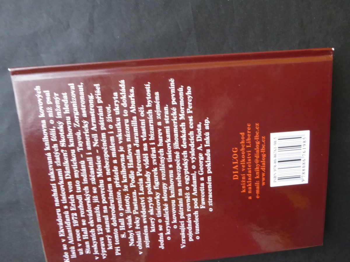 | Digitalizovaná tiráž: | Stan Hall ARCHIVY ATLANTIDY - ZLATO TAYOU Nové důkazy existence kovové knihovny a jejího původu v Atlantidě Z německé verze Tayos Gold, vydané nakladatelstvím Jochen Kopp v roce 2008, přeložila Natálie Hendrychová. Foto na přebalu: archiv Ericha von Däniken. Vydal Dialog, knižní velkoobchod a nakladatelství, Markova 3, 460 14 Liberec 14, v roce 2009. www.dialog-lbc.cz * e-mail: knihy@dialog-lbc.cz Komplexní jazykové zpracování, obálka a grafická úprava Redakční a typografické studio Oldřich Škrbel a Roman Karpaš. Vydání první, 216 stran. Tisk a vazba Těšínská tiskárna, a. s., Štefánikova 2, 737 36 Český Těšín. AA text 9,78, ilustrace 1,64, VA 11,68 ISBN 978-80-86761-98-5 |