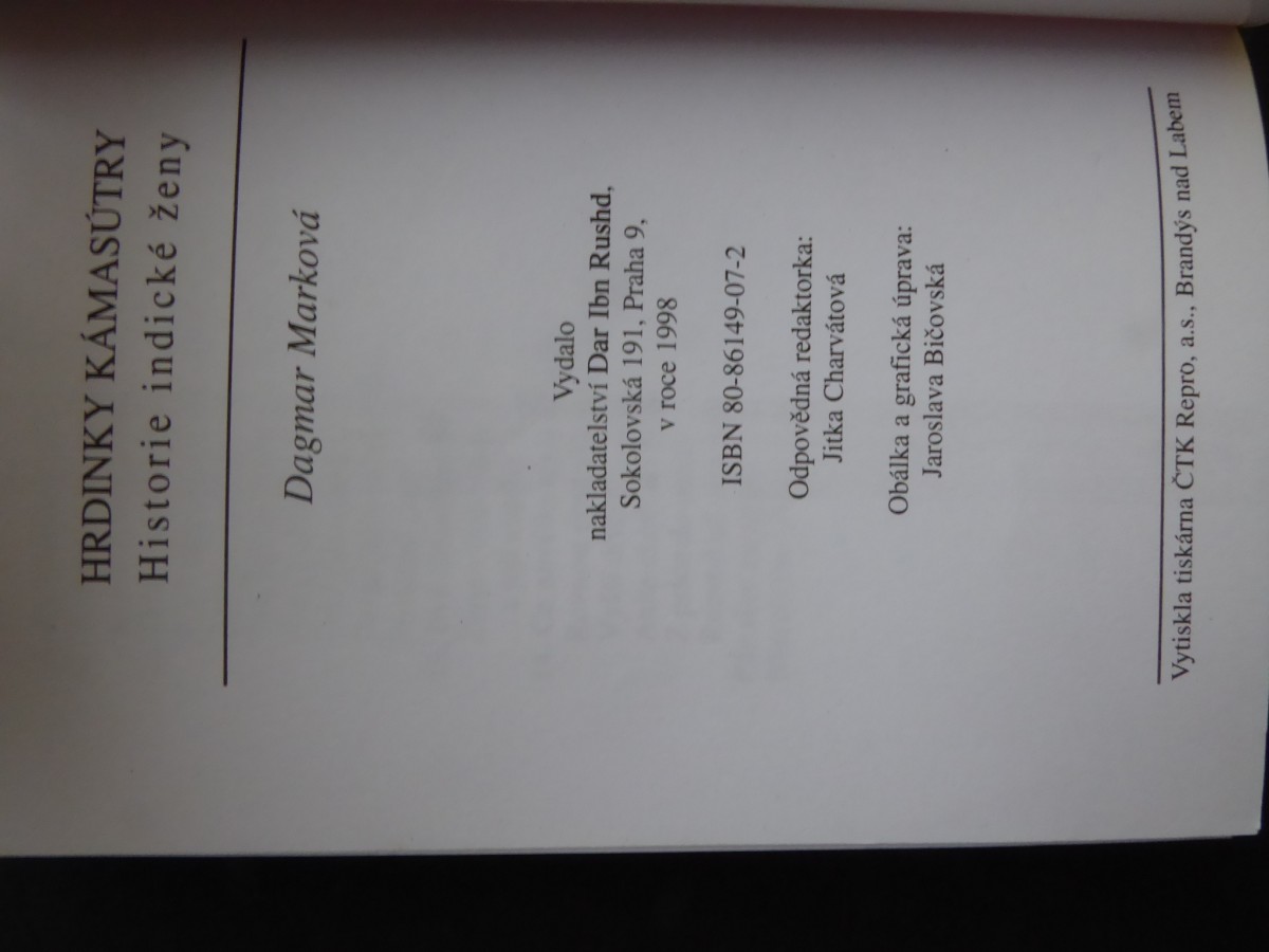 | Digitalizovaná tiráž: | HRDINKY KÁMASÚTRY Historie indické ženy Dagmar Marková Vydalo nakladatelství Dar Ibn Rushd, Sokolovská 191, Praha 9, v roce 1998 ISBN 80-86149-07-2 Odpovědná redaktorka: Jitka Charvátová Obálka a grafická úprava: Jaroslava Bičovská Vytiskla tiskárna ČTK Repro, a.s., Brandýs nad Labem |