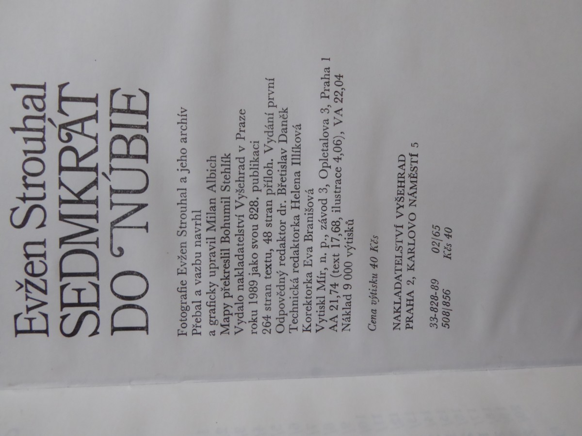 | Digitalizovaná tiráž: | Evžen Strouhal SEDMKRAT DO NÚBIE Fotografie Evžen Strouhal a jeho archív Přebal a vazbu navrhl a graficky upravil Milan Albich Mapy překreslil Bohumil Stehlík Vydalo nakladatelství Vyšehrad v Praze roku 1989 jako svou 828. publikaci 264 stran textu, 48 stran příloh. Vydání první Odpovědný redaktor dr. Břetislav Daněk Technická redaktorka Helena Illíková Korektorka Eva Branišová Vytiskl Mír, n. p., závod 3, Opletalova 3, Praha 1 AA 21,74 (text 17,68, ilustrace 4,06), VA 22,04 Náklad 9 000 výtisků Cena výtisku 40 Kčs NAKLADATELSTVÍ VYŠEHRAD PRAHA 2, KARLOVO NÁMĚSTÍ 5 33-828-89 02/65 508/856 Kčs 40 |