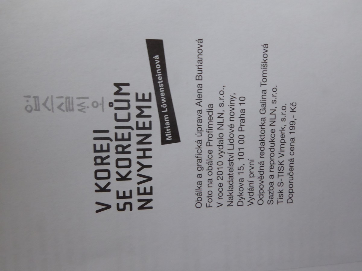| Digitalizovaná tiráž: | 앱스실씨. V KOREJI SE KOREJCŮM NEVYHNEME Miriam Löwensteinová Obálka a grafická úprava Alena Burianová Foto na obálce Profimedia V roce 2010 vydalo NLN, s.r.o., Nakladatelství Lidové noviny, Dykova 15, 101 00 Praha 10 Vydání první Odpovědná redaktorka Galina Tomíšková Sazba a reprodukce NLN, s.r.o. Tisk S-TISK Vimperk, s.r.o. Doporučená cena 199,- Kč |