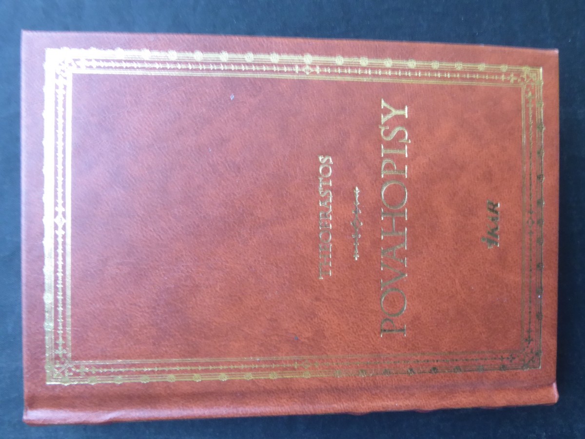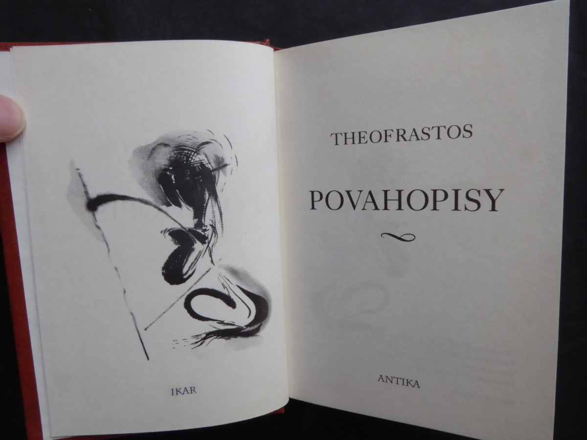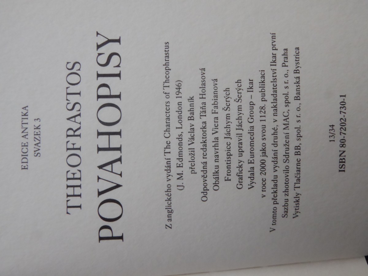 | Digitalizovaná tiráž: | EDICE ANTIKA SVAZEK 3 THEOFRASTOS POVAHOPISY Z anglického vydání The Characters of Theophrastus (J. M. Edmonds, London 1946) přeložil Václav Bahník Odpovědná redaktorka Táňa Holasová Obálku navrhla Viera Fabianová Frontispice Jáchym Šerých Graficky upravil Jáchym Šerých Vydala Euromedia Group - Ikar v roce 2000 jako svou 1128. publikaci V tomto překladu vydání druhé, v nakladatelství Ikar první Sazbu zhotovilo Sdružení MAC, spol. s r. o., Praha Vytiskly Tlačiarne BB, spol. s r. o., Banská Bystrica 13/34 ISBN 80-7202-730-1 |