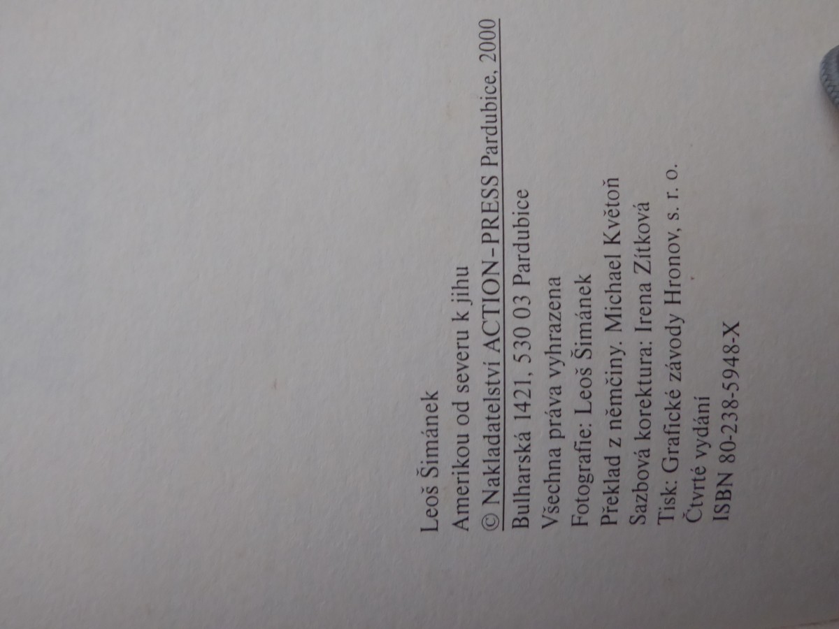 | Digitalizovaná tiráž: | Leoš Šimánek Amerikou od severu k jihu Nakladatelství ACTION-PRESS Pardubice, 2000 Bulharská 1421, 530 03 Pardubice Všechna práva vyhrazena Fotografie: Leoš Šimánek Překlad z němčiny. Michael Květoň Sazbová korektura: Irena Zítková Tisk: Grafické závody Hronov, s. r. O. Čtvrté vydání ISBN 80-238-5948-X |