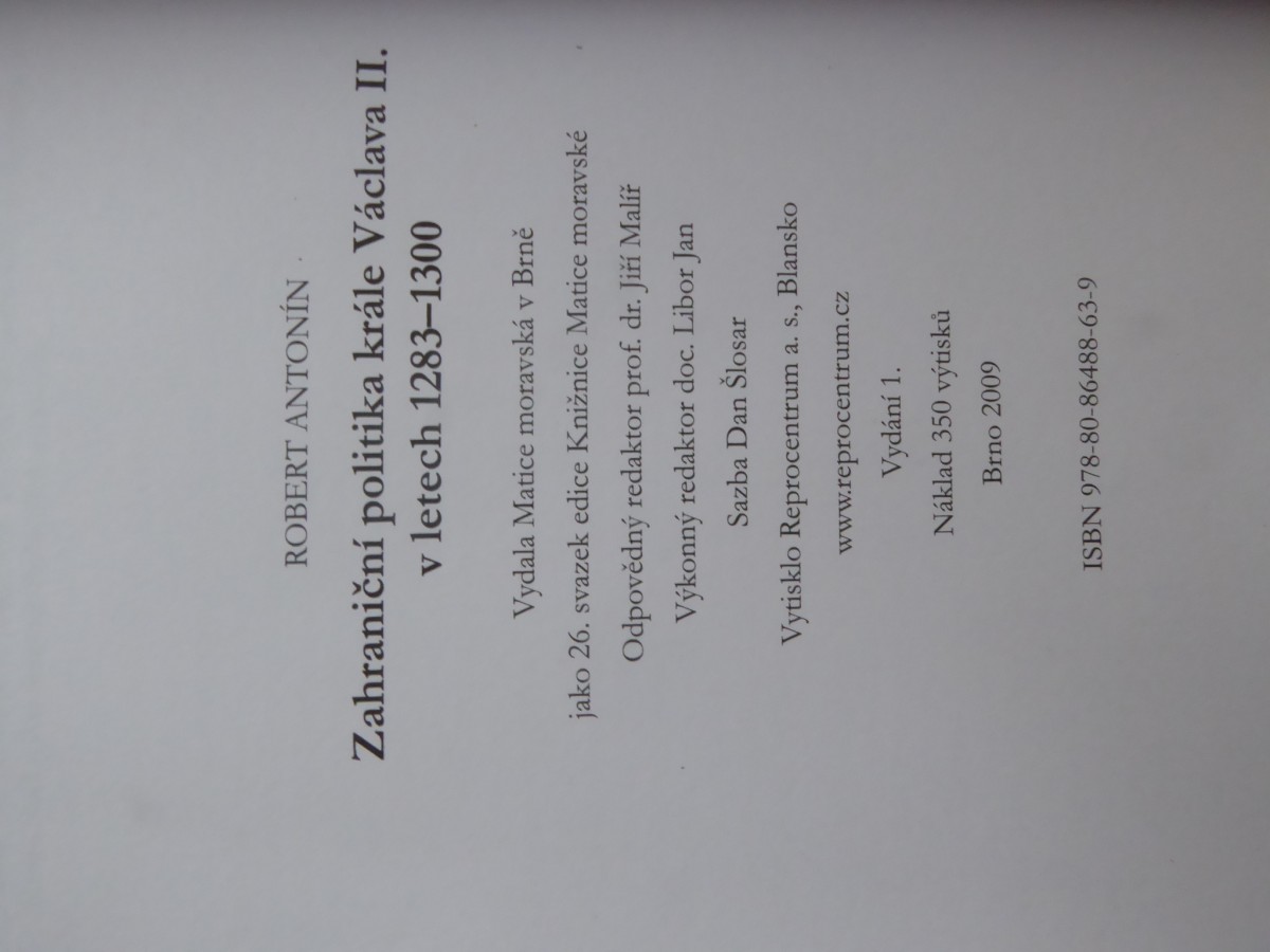 | Digitalizovaná tiráž: | ROBERT ANTONÍN Zahraniční politika krále Václava II. v letech 1283-1300 Vydala Matice moravská v Brně jako 26. svazek edice Knižnice Matice moravské Odpovědný redaktor prof. dr. Jiří Malíř Výkonný redaktor doc. Libor Jan Sazba Dan Šlosar Vytisklo Reprocentrum a. s., Blansko www.reprocentrum.cz Vydání 1. Náklad 350 výtisků Brno 2009 ISBN 978-80-86488-63-9 |