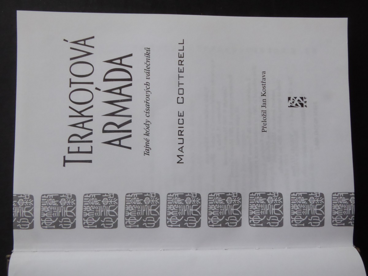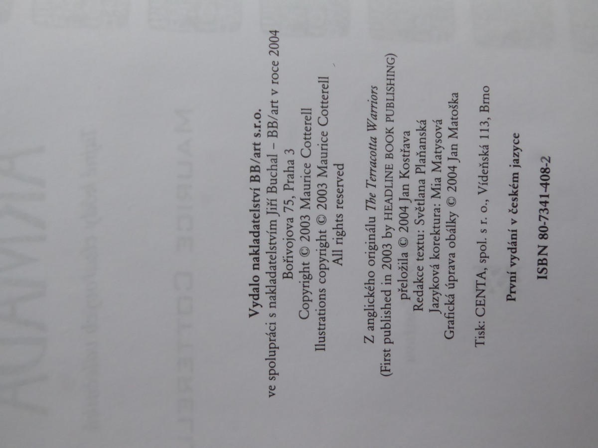 | Digitalizovaná tiráž: | TOO 301ЯUAM Vydalo nakladatelství BB/art s.r.o. ve spolupráci s nakladatelstvím Jiří Buchal - BB/art v roce 2004 Bořivojova 75, Praha 3 Copyright 2003 Maurice Cotterell Ilustrations copyright © 2003 Maurice Cotterell All rights reserved Z anglického originálu The Terracotta Warriors (First published in 2003 by HEADLINE BOOK PUBLISHING) přeložila 2004 Jan Kostřava Redakce textu: Světlana Plaňanská Jazyková korektura: Mia Matysová Grafická úprava obálky 2004 Jan Matoška Tisk: CENTA, spol. s r. o., Vídeňská 113, Brno První vydání v českém jazyce ISBN 80-7341-408-2 |