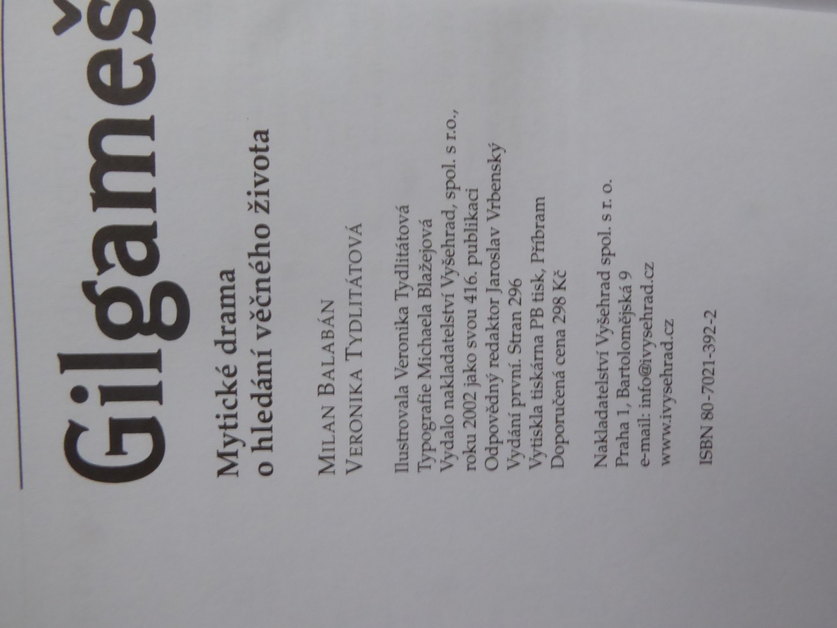 | Digitalizovaná tiráž: | Gilgameš Mytické drama o hledání věčného života MILAN BALABAN VERONIKA TYDLITÁTOVÁ Ilustrovala Veronika Tydlitátová Typografie Michaela Blažejová Vydalo nakladatelství Vyšehrad, spol. s r.o., roku 2002 jako svou 416. publikaci Odpovědný redaktor Jaroslav Vrbenský Vydání první. Stran 296 Vytiskla tiskárna PB tisk, Příbram Doporučená cena 298 Kč Nakladatelství Vyšehrad spol. s r. o. Praha 1, Bartolomějská 9 e-mail: info@ivysehrad.cz www.ivysehrad.cz ISBN 80-7021-392-2 |