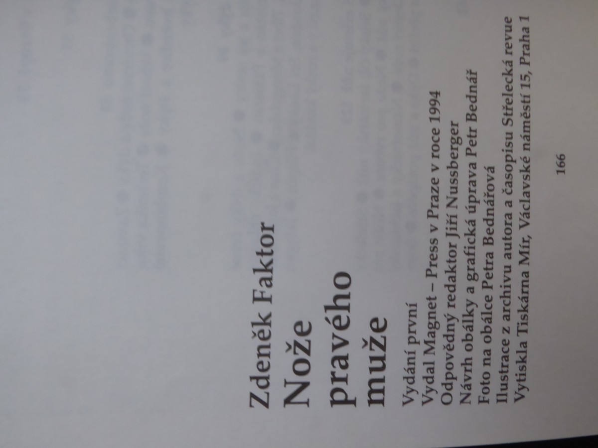 | Digitalizovaná tiráž: | Zdeněk Faktor Nože pravého muže Vydání první Vydal Magnet - Press v Praze v roce 1994 Odpovědný redaktor Jiří Nussberger Návrh obálky a grafická úprava Petr Bednář Foto na obálce Petra Bednářová Ilustrace z archivu autora a časopisu Střelecká revue Vytiskla Tiskárna Mír, Václavské náměstí 15, Praha 1 166 |