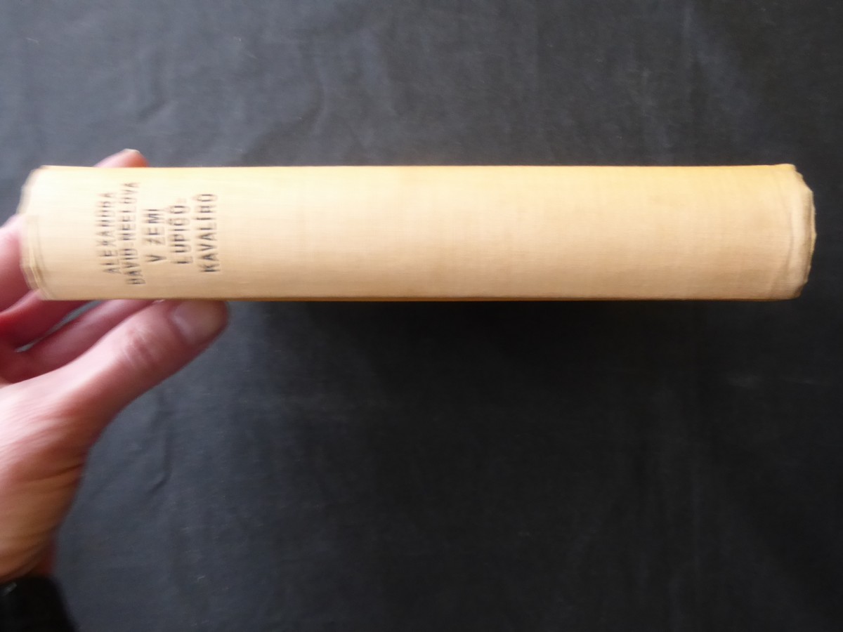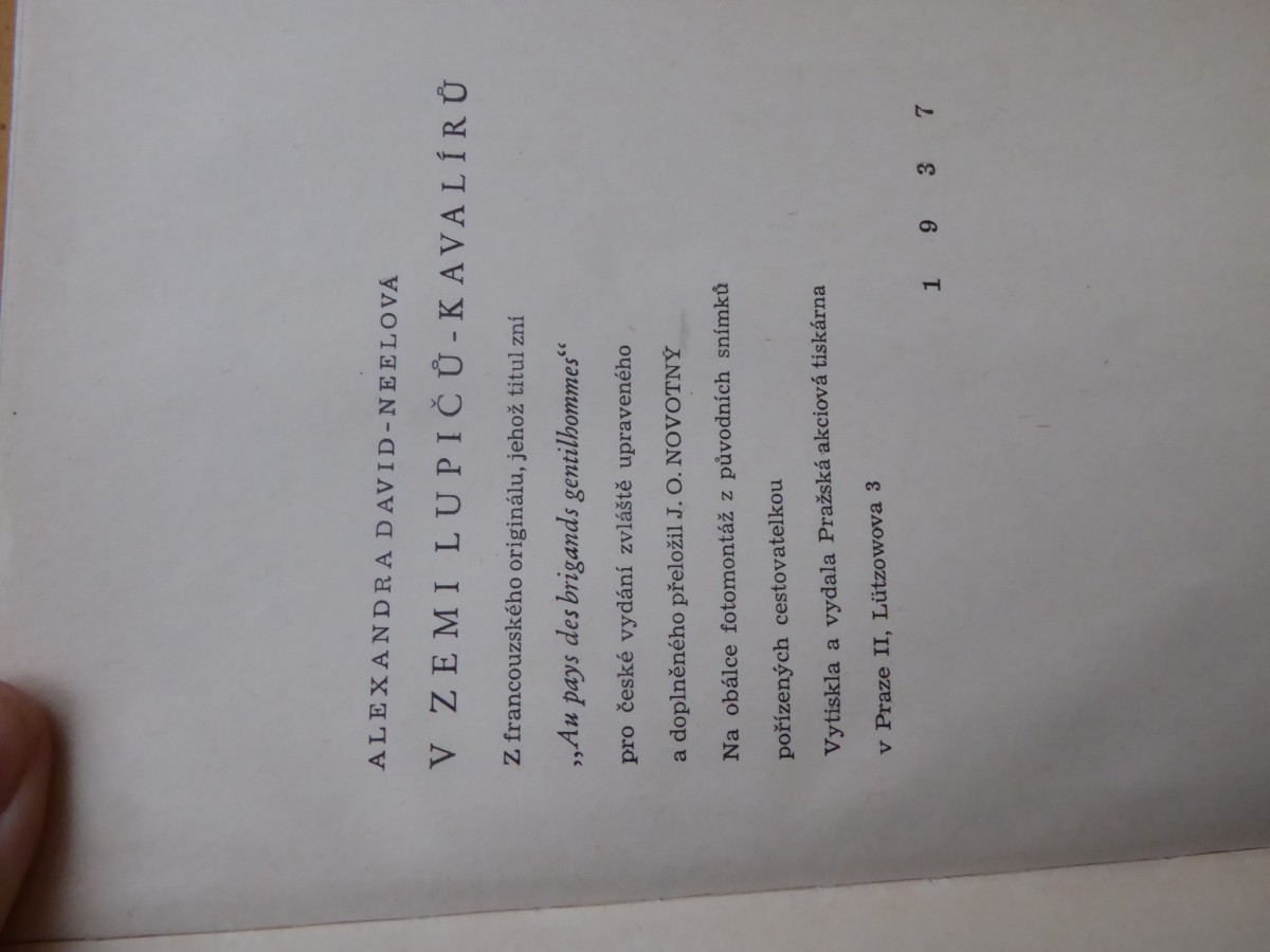 | Digitalizovaná tiráž: | ALEXANDRA DAVID-NEELOVÁ V ZEMI LUPIČŮ-KAVA LÍRŮ Z francouzského originálu, jehož titul zní ,,Au pays des brigands gentilhommes" pro české vydání zvláště upraveného a doplněného přeložil J. O. NOVOTNÝ Na obálce fotomontáž z původních snímků pořízených cestovatelkou Vytiskla a vydala Pražská akciová tiskárna v Praze II, Lützowova 3 1 9 3 7 |