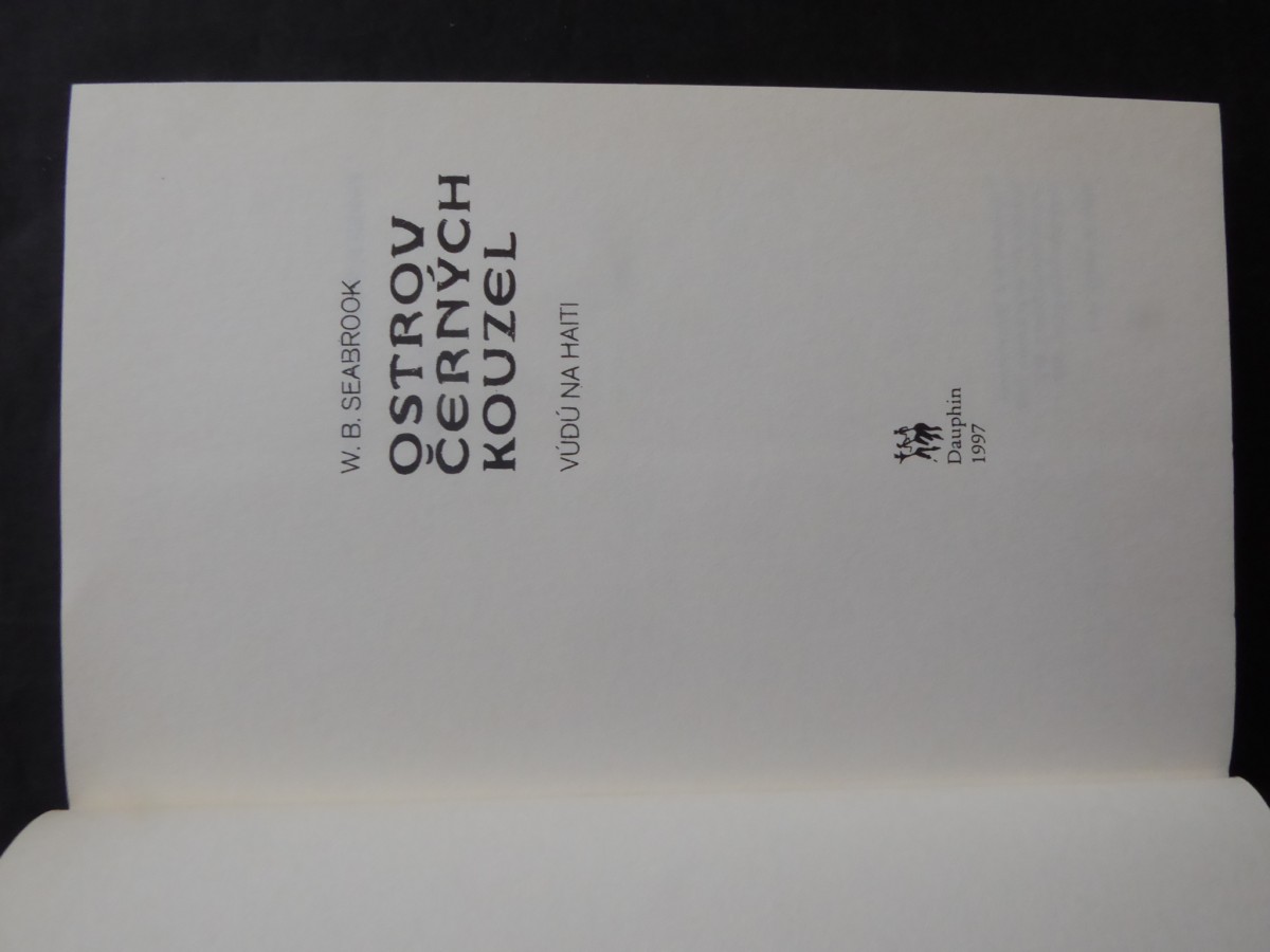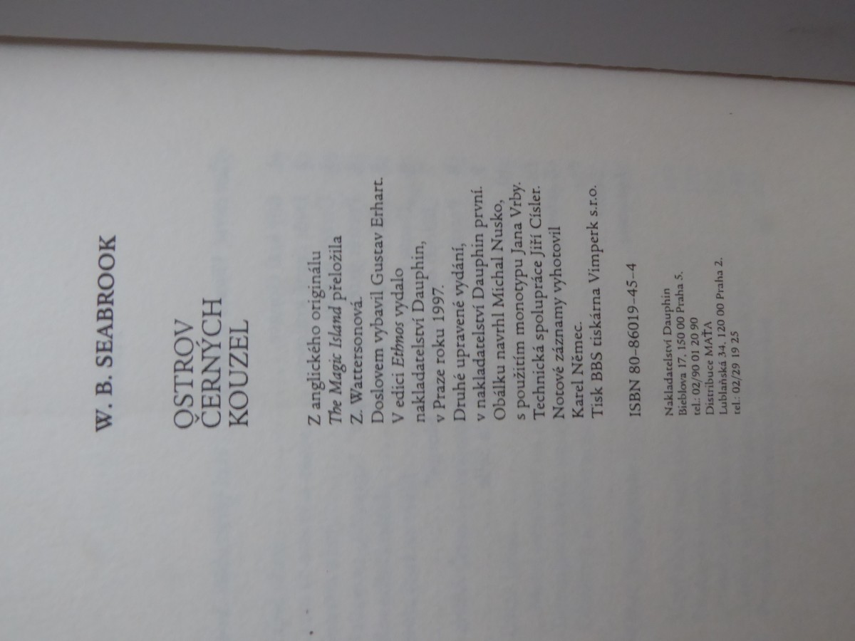 | Digitalizovaná tiráž: | W. B. SEABROOK OSTROV CERNYCH KOUZEL Z anglického originálu The Magic Island přeložila Z. Wattersonová. Doslovem vybavil Gustav Erhart. V edici Ethnos vydalo nakladatelství Dauphin, v Praze roku 1997. Druhé upravené vydání, v nakladatelství Dauphin první. Obálku navrhl Michal Nusko, s použitím monotypu Jana Vrby. Technická spolupráce Jiří Císler. Notové záznamy vyhotovil Karel Němec. Tisk BBS tiskárna Vimperk s.r.o. ISBN 80-86019-45-4 Nakladatelství Dauphin Bieblova 17, 150 00 Praha 5. tel.: 02/90 01 20 90 Distribuce MAŤA Lublaňská 34, 120 00 Praha 2. tel.: 02/29 19 25 |