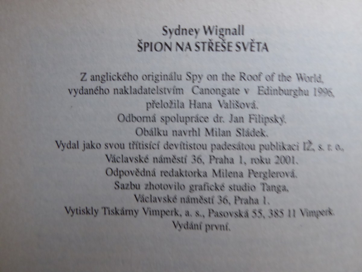 | Digitalizovaná tiráž: | Sydney Wignall SPION NA STŘEŠE SVĚTA Z anglického originálu Spy on the Roof of the World. vydaného nakladatelstvím Canongate v Edinburghu 1996, přeložila Hana Vališová. Odborná spolupráce dr. Jan Filipsky Obálku navrhl Milan Sládek. Vydal jako svou třítisící devítistou padesátou publikaci IZ, sro, Václavské náměstí 36, Praha 1, roku 2001. Odpovědná redaktorka Milena Perglerová. Sazbu zhotovilo grafické studio Tanga, Václavské náměstí 36, Praha 1. Vytiskly Tiskárny Vimperk, a. s., Pasovská 55, 385 11 Vimperk Vydání první. |