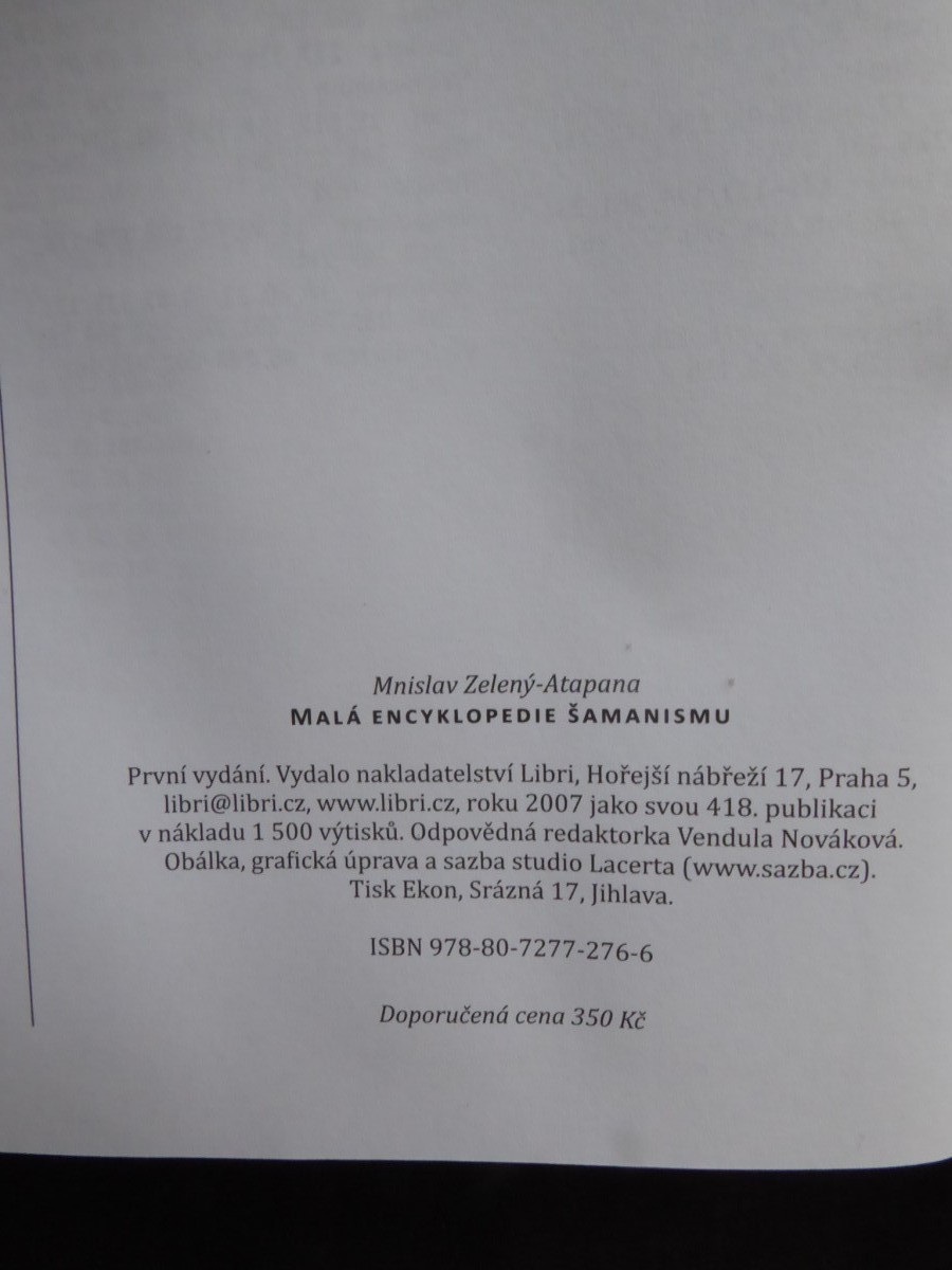 | Digitalizovaná tiráž: | Mnislav Zelený-Atapana MALÁ ENCYKLOPEDIE ŠAMANISMU První vydání. Vydalo nakladatelství Libri, Hořejší nábřeží 17, Praha 5, libri@libri.cz, www.libri.cz, roku 2007 jako svou 418. publikaci v nákladu 1 500 výtisků. Odpovědná redaktorka Vendula Nováková. Obálka, grafická úprava a sazba studio Lacerta (www.sazba.cz). Tisk Ekon, Srázná 17, Jihlava. ISBN 978-80-7277-276-6 Doporučená cena 350 Kč |