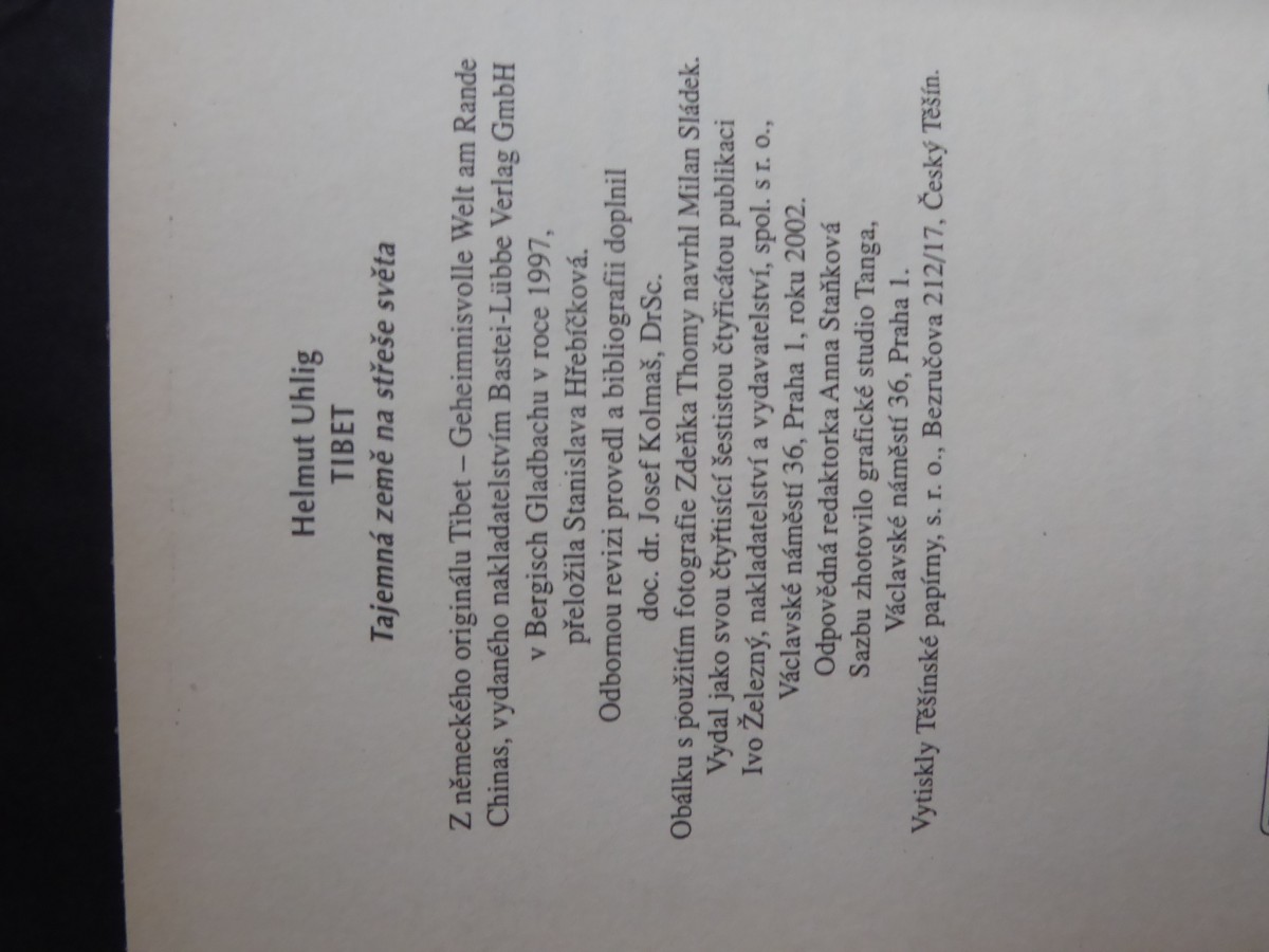 | Digitalizovaná tiráž: | Helmut Uhlig TIBET Tajemná země na střeše světa Z německého originálu Tibet - Geheimnisvolle Welt am Rande Chinas, vydaného nakladatelstvím Bastei-Lübbe Verlag GmbH v Bergisch Gladbachu v roce 1997, přeložila Stanislava Hřebíčková. Odbornou revizi provedl a bibliografii doplnil doc. dr. Josef Kolmaš, DrSc. Obálku s použitím fotografie Zdeňka Thomy navrhl Milan Sládek. Vydal jako svou čtyřtisící šestistou čtyřicátou publikaci Ivo Železný, nakladatelství a vydavatelství, spol. s r. O., Václavské náměstí 36, Praha 1, roku 2002. Odpovědná redaktorka Anna Staňková Sazbu zhotovilo grafické studio Tanga, Václavské náměstí 36, Praha 1. Vytiskly Těšínské papírny, s. r. o., Bezručova 212/17, Český Těšín. |