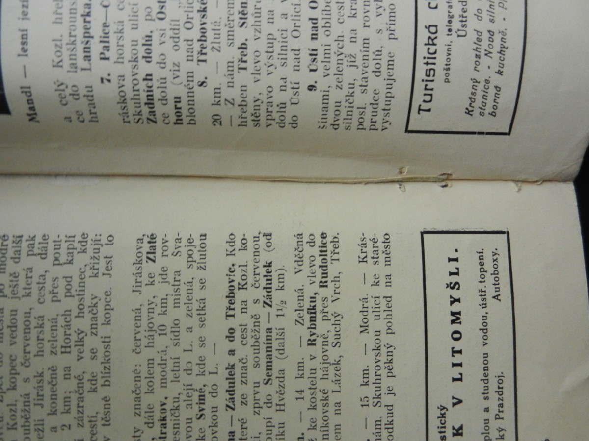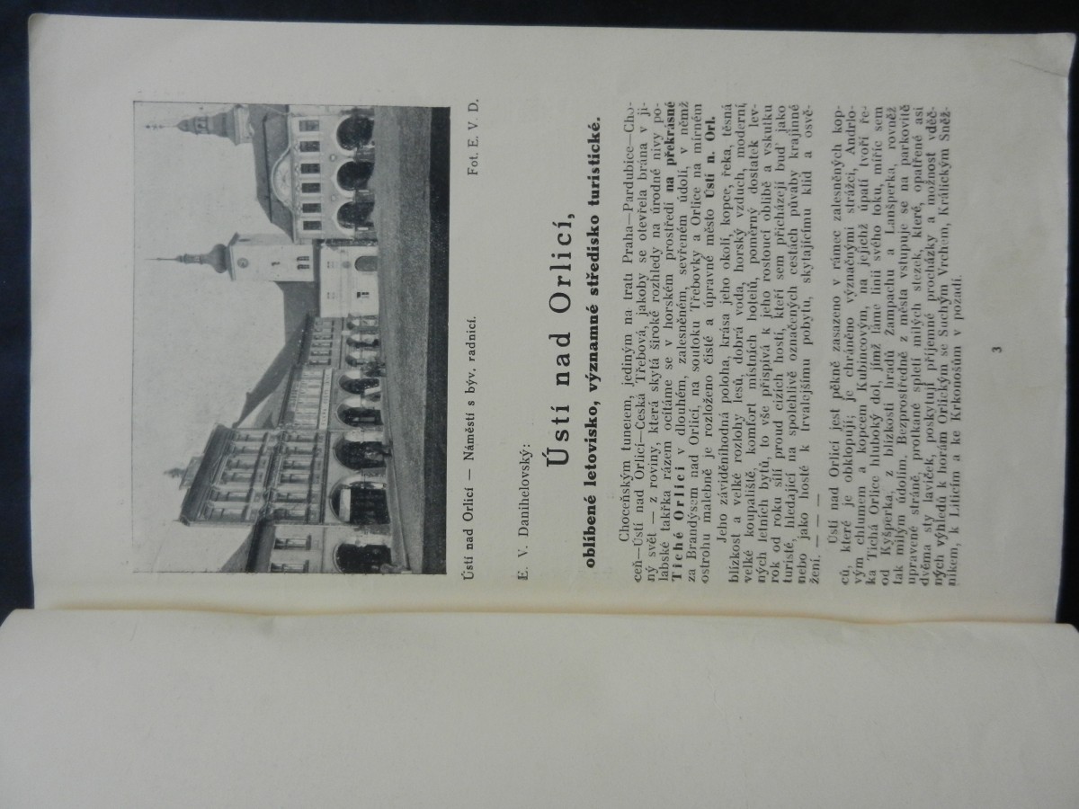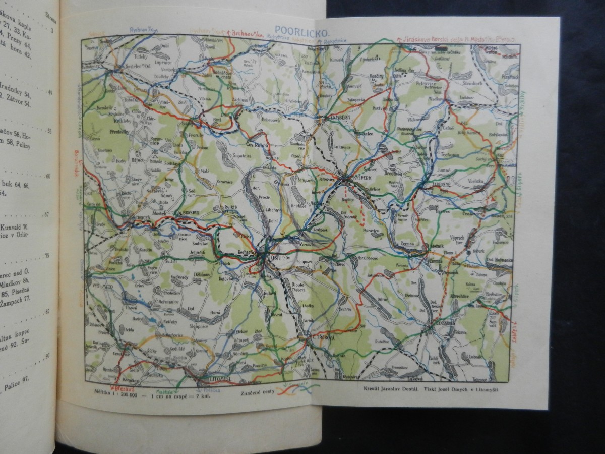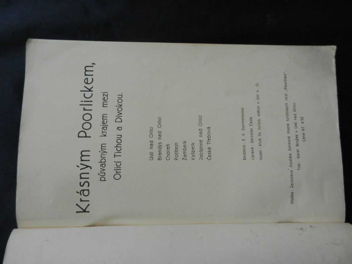| Digitalizovaná tiráž: | Krásným Poorlickem, půvabným krajem mezi Orlicí Tichou a Divokou. Ústí nad Orlicí Brandýs nad Orlicí Choceň Potštejn Žamberk Kyšperk Jablonné nad Orlicí Česká Třebová Redakce: E. V. Danihelovský. Uprava: Jaroslav Čada. Vydal: Klub čs. turistů, odbor v Usti n. O. Vložka: Jaroslava Dostála barevná mapa turistických cest Poorlicko". Tisk: Karel Brożek v Usti nad Orlicí. Cena Kč 6 50 |