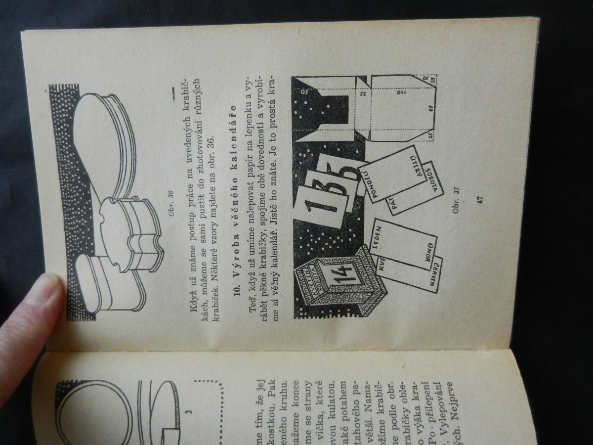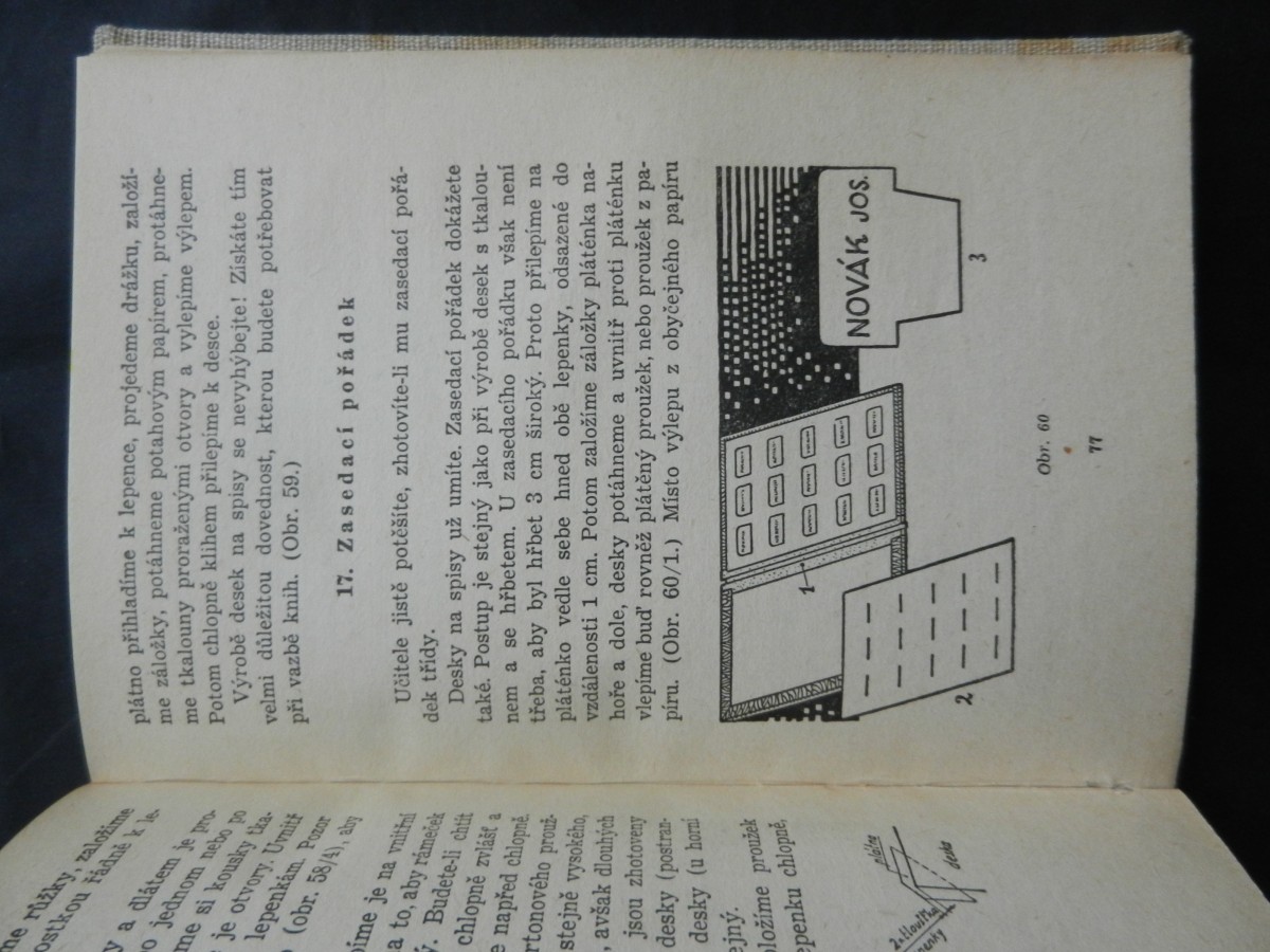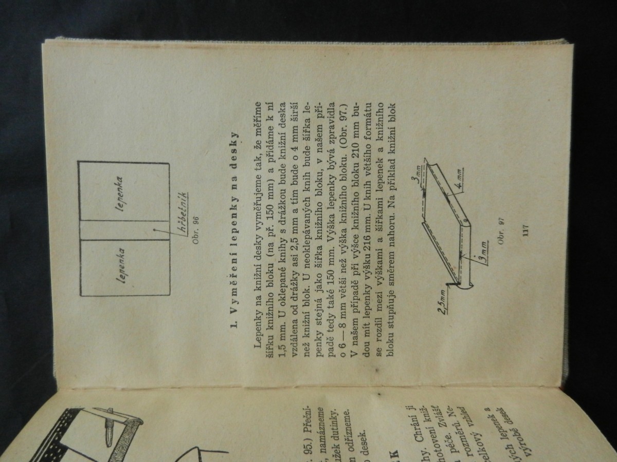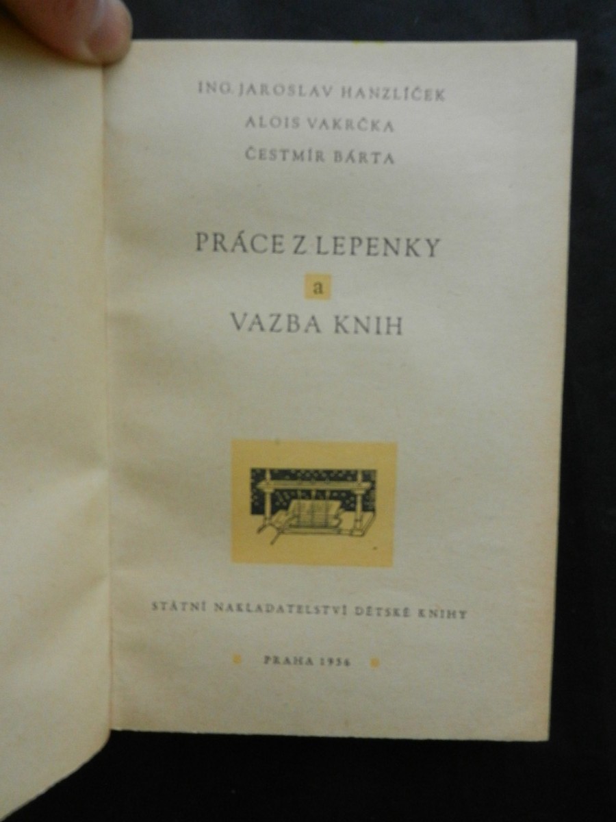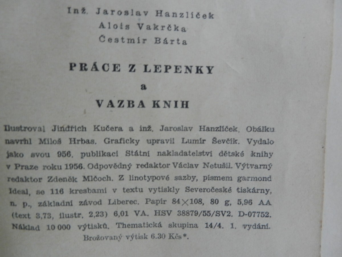 | Digitalizovaná tiráž: | Int. Jaroslav Hanzlíček Alois Vakrčka Čestmír Bárta PRÁCE Z LEPENKY a VAZBA KNIH Ilustroval Jindřich Kučera a inž. Jaroslav Hanzlíček, Obálku navrhl Miloš Hrbas. Graficky upravil Lumír Ševčík. Vydalo jako svou 956, publikaci Státní nakladatelství dětské knihy v Praze roku 1956. Odpovědný redaktor Václav Netušil. Výtvarný redaktor Zdeněk Mlčoch. Z linotypové sazby, písmem garmond Ideal, se 116 kresbami v textu vytiskly Severočeské tiskárny, n. p., základní závod Liberec. Papír 84X108, 80 g, 5,96 AA (text 3,73, ilustr. 2,23) 6,01 VA. HSV 38879/55/SV2. D-07752. Náklad 10 000 výtisků. Thematická skupina 14/4. 1. vydání. Brožovaný výtisk 6.30 Kčs*. |