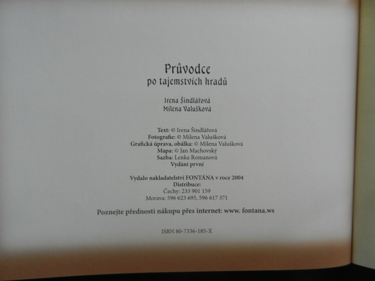 | Digitalizovaná tiráž: | Průvodce po tajemstvích hradů Irena Šindlářová Milena Valušková Text: Irena Šindlářová Fotografie: Milena Valušková Grafická úprava, obálka: Milena Valušková Mapa: Jan Machovský Sazba: Lenka Romanová Vydání první Vydalo nakladatelství FONTÁNA v roce 2004 Distribuce: Čechy: 233 901 159 Morava: 596 623 695, 596 617 371 Poznejte přednosti nákupu přes internet: www. fontana.ws ISBN 80-7336-185-X |