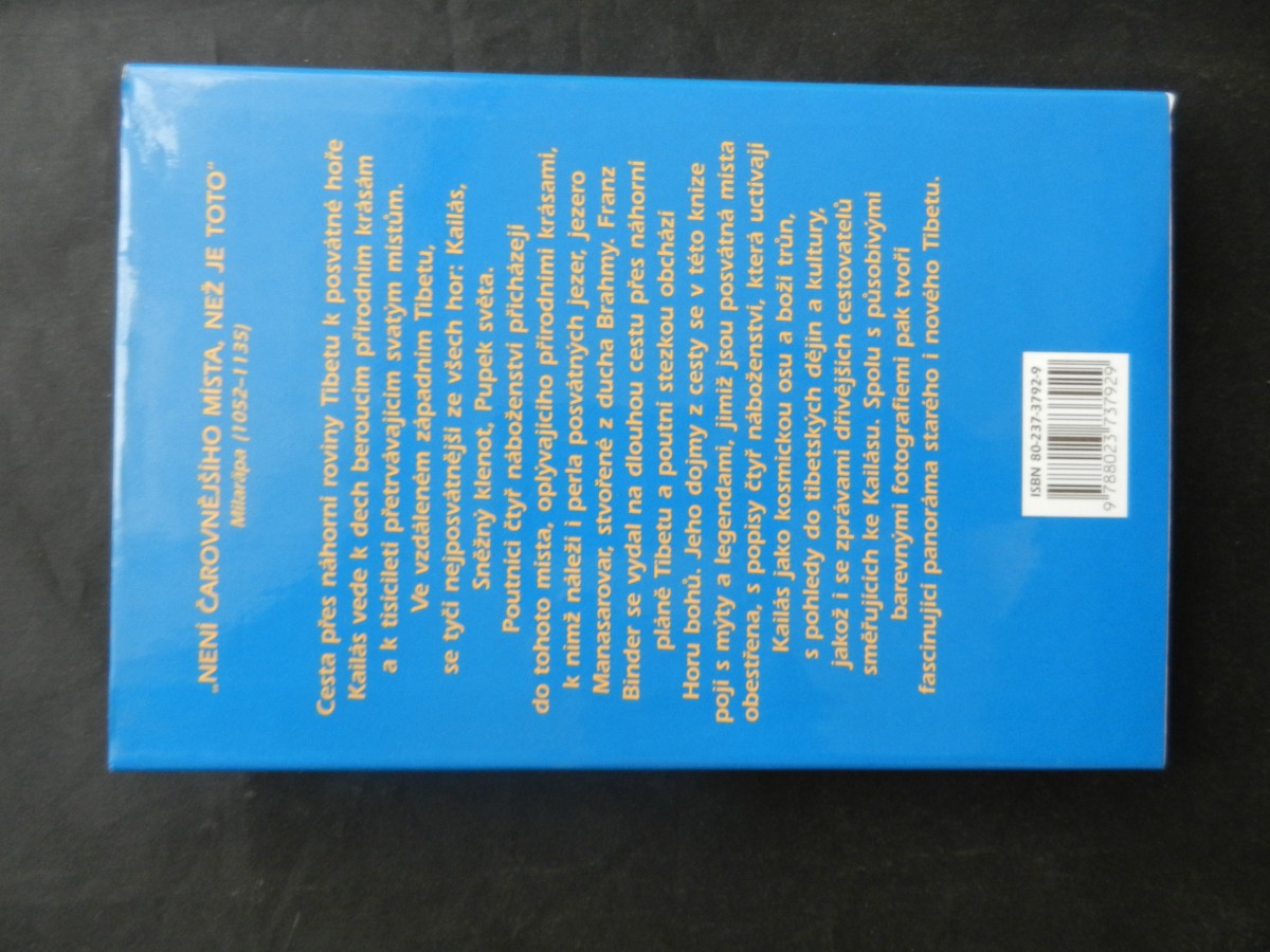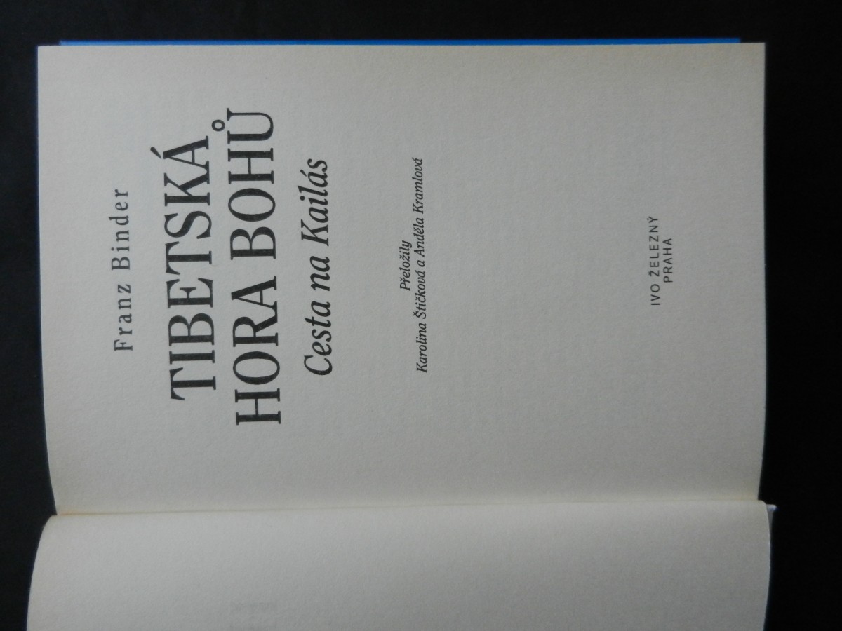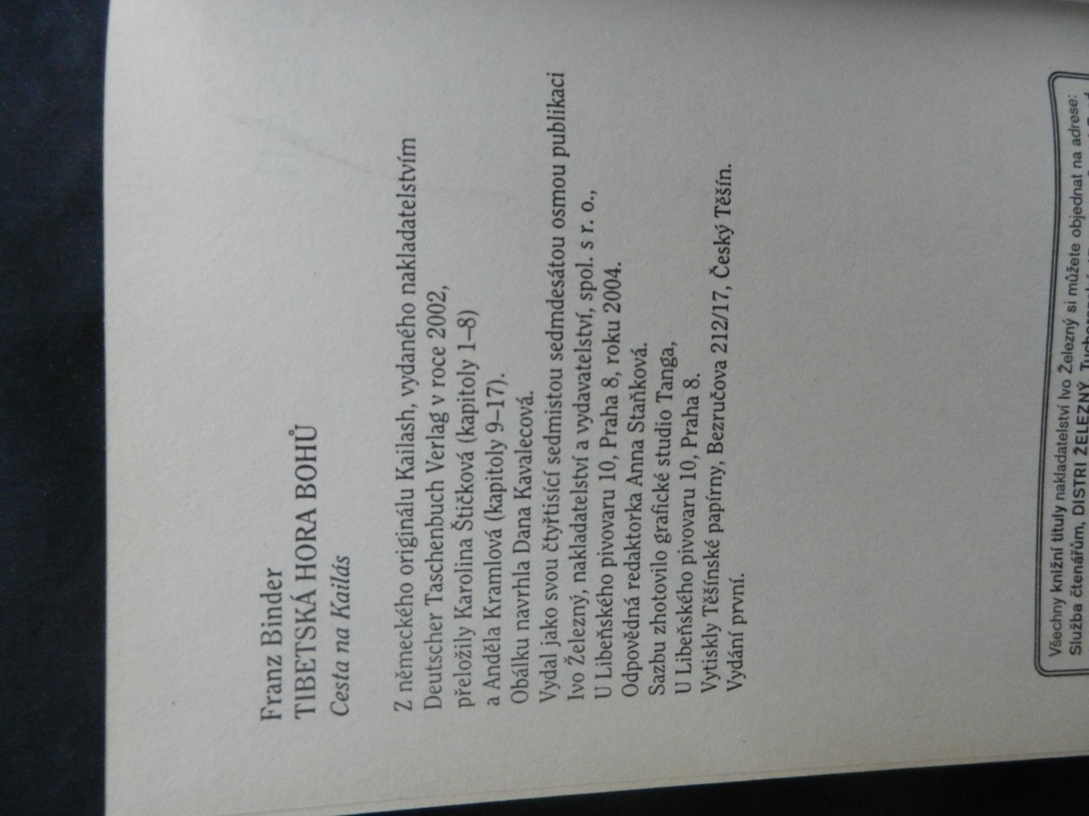 | Digitalizovaná tiráž: | Franz Binder TIBETSKÁ HORA BOHŮ Cesta na Kailás Z německého originálu Kailash, vydaného nakladatelstvím Deutscher Taschenbuch Verlag v roce 2002, přeložily Karolina Štičková (kapitoly 1-8) a Anděla Kramlová (kapitoly 9-17). Obálku navrhla Dana Kavalecová. Vydal jako svou čtyřtisící sedmistou sedmdesátou osmou publikaci Ivo Železný, nakladatelství a vydavatelství, spol. s r. o., U Libeňského pivovaru 10, Praha 8, roku 2004. Odpovědná redaktorka Anna Staňková. Sazbu zhotovilo grafické studio Tanga, U Libeňského pivovaru 10, Praha 8. Vytiskly Těšínské papírny, Bezručova 212/17, Český Těšín. Vydání první. Všechny knižní tituly nakladatelství Ivo Železný si můžete objednat na adrese: Služba čtenářům, DISTRI ŽELEZNY |