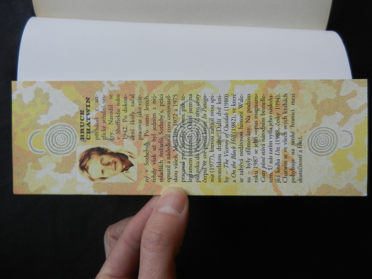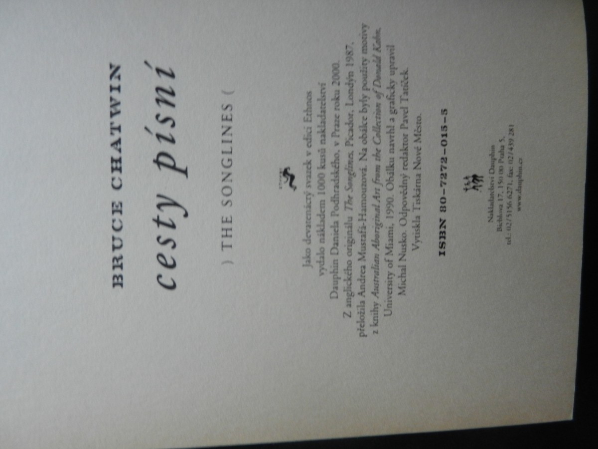 | Digitalizovaná tiráž: | BRUCE CHATWIN cesty písní ) THE SONGLINES ( Jako devatenáctý svazek v edici Ethnos vydalo nákladem 1000 kusů nakladatelství Dauphin Daniela Podhradského, v Praze roku 2000. Z anglického originálu The Songlines, Picador, Londýn 1987. přeložila Andrea Mustafi-Hamouzová. Na obálce byly použity motivy 2 knihy Australian Aboriginal Art from the Collection of Donald Kabn University of Miami, 1990. Obálku navrhl a graficky upravil Michal Nusko. Odpovědný redaktor Pavel Tatiček. Vytiskla Tiskárna Nové Město. ISBN 80-7272-015-5 Nakladatelství Dauphin Bichlova 17, 150 00 Praha 5. tel.: 02/5156 6271, fax: 02/439 281 www.dauphin.c |