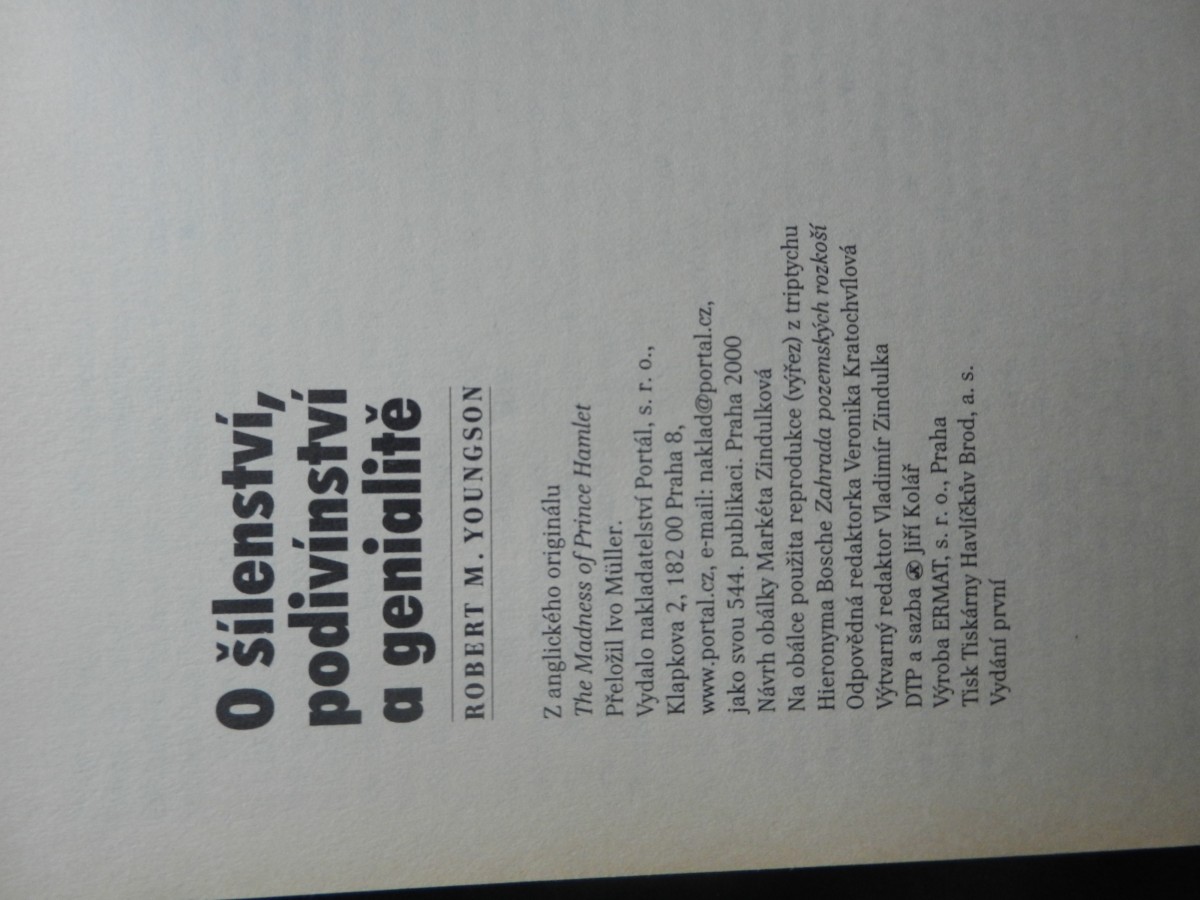| Digitalizovaná tiráž: | O šílenství, podivínství a genialitě ROBERT M. YOUNGSON Z anglického originálu The Madness of Prince Hamlet Přeložil Ivo Müller. Vydalo nakladatelství Portál, s. r. o., Klapkova 2, 182 00 Praha 8, www.portal.cz, e-mail: naklad@portal.cz, jako svou 544. publikaci. Praha 2000 Návrh obálky Markéta Zindulková Na obálce použita reprodukce (výřez) z triptychu Hieronyma Bosche Zahrada pozemských rozkoší Odpovědná redaktorka Veronika Kratochvílová Výtvarný redaktor Vladimír Zindulka DTP a sazba Jiří Kolář Výroba ERMAT, s. r. o., Praha Tisk Tiskárny Havlíčkův Brod, a. s. Vydání první |