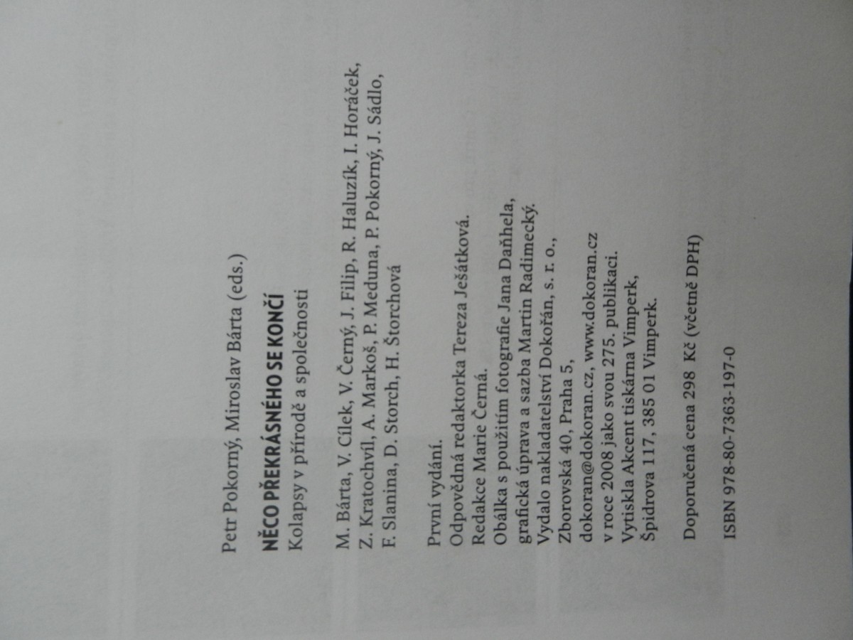| Digitalizovaná tiráž: | Petr Pokorný, Miroslav Bárta (eds.) NĚCO PŘEKRÁSNÉHO SE KONČÍ Kolapsy v přírodě a společnosti M. Bárta, V. Cílek, V. Černý, J. Filip, R. Haluzík, I. Horáček, Z. Kratochvíl, A. Markoš, P. Meduna, P. Pokorný, J. Sádlo, F. Slanina, D. Storch, H. Štorchová První vydání. Odpovědná redaktorka Tereza Ješátková. Redakce Marie Černá. Obálka s použitím fotografie Jana Daňhela, grafická úprava a sazba Martin Radimecký. Vydalo nakladatelství Dokořán, s. r. o., Zborovská 40, Praha 5, dokoran@dokoran.cz, www.dokoran.cz v roce 2008 jako svou 275. publikaci. Vytiskla Akcent tiskárna Vimperk, Špidrova 117, 385 01 Vimperk. Doporučená cena 298 Kč (včetně DPH) ISBN 978-80-7363-197-0 |