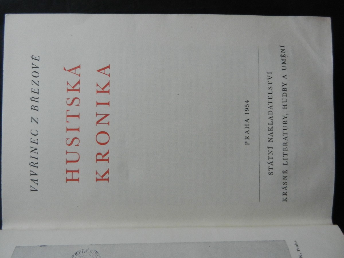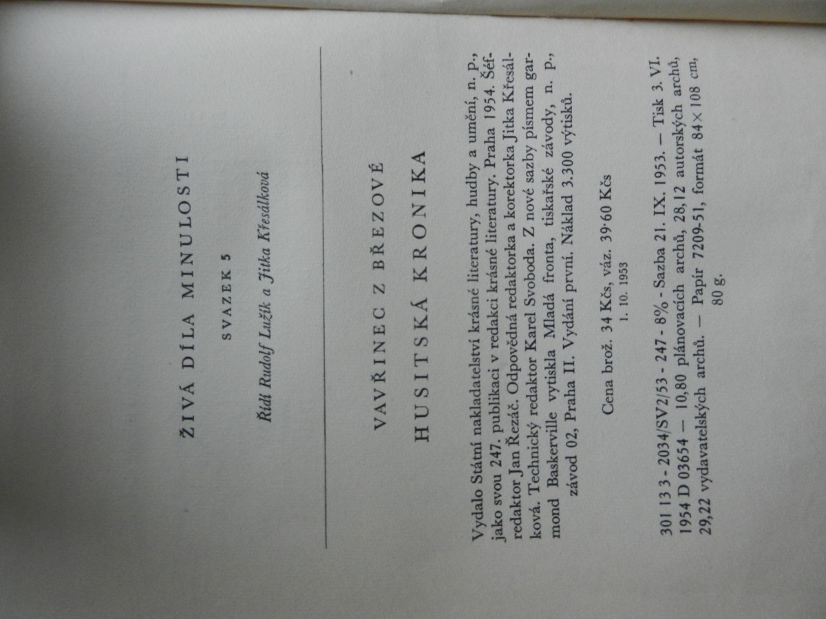 | Digitalizovaná tiráž: | ŽIVÁ DÍLA MINULOSTI SVAZEK 5 Řídí Rudolf Lužík a Jitka Křesálková VAVŘINEC Z BŘEZOVÉ HUSITSKÁ KRONIKA Vydalo Státní nakladatelství krásné literatury, hudby a umění, n. p., jako svou 247. publikaci v redakci krásné literatury. Praha 1954. Šéf- redaktor Jan Řezáč. Odpovědná redaktorka a korektorka Jitka Křesál- ková. Technický redaktor Karel Svoboda. Z nové sazby písmem gar- mond Baskerville vytiskla Mladá fronta, tiskařské závody, n. p., závod 02, Praha II. Vydání první. Náklad 3.300 výtisků. Cena brož. 34 Kčs, váz. 39-60 Kčs 1. 10. 1953 301 13 3-2034/SV2/53-247-8% - Sazba 21. IX. 1953. Tisk 3. VI. 1954 D 03654 - 10,80 plánovacích archů, 28, 12 autorských archů, 29,22 vydavatelských archů. Papír 7209-51, formát 84x 108 cm, - 80 g. |