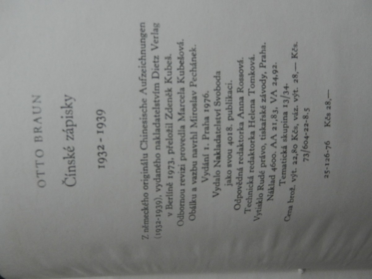 | Digitalizovaná tiráž: | OTTO BRAUN Čínské zápisky 1932-1939 Z německého originálu Chinesische Aufzeichnungen (1932-1939), vydaného nakladatelstvím Dietz Verlag v Berlíně 1973, přeložil Zdeněk Kubeš. Odbornou revizi provedla Marcela Kubešová. Obálku a vazbu navrhl Miroslav Pechánek. Vydání 1. Praha 1976. Vydalo Nakladatelství Svoboda jako svou 4018. publikaci. Odpovědná redaktorka Anna Rossová. Technická redaktorka Helena Tomková. Vytisklo Rudé právo, tiskařské závody, Praha. Náklad 4600. AA 21,83, VA 24.92. Tematická skupina 13/34- Cena brož. výt. 22,80 Kčs, váz. výt. 28,- Kčs. 73/604-22-8.5 25-126-76 Kčs 28,- |