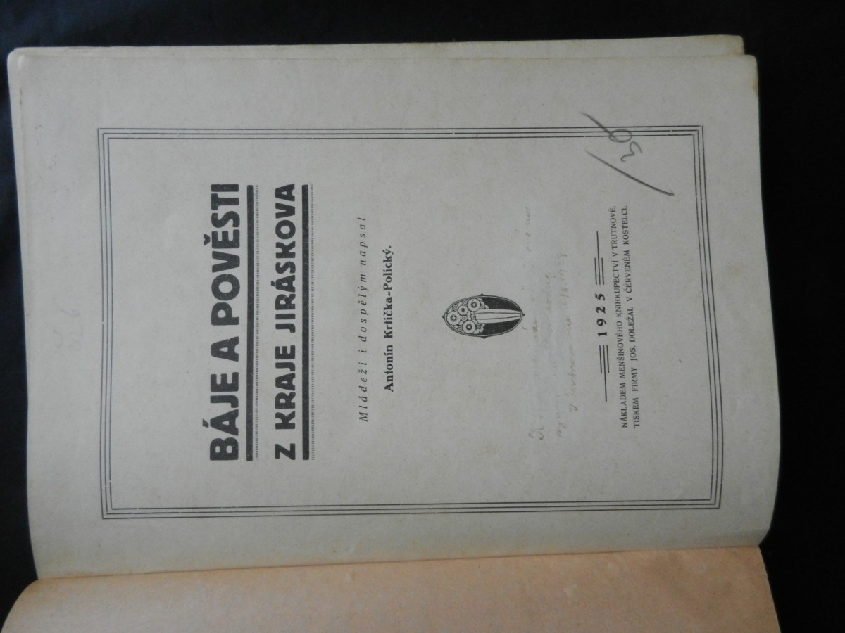| Digitalizovaná tiráž: | BÁJE A POVĚSTI Z KRAJE JIRÁSKOVA Mládeži i dospělým napsal Antonín Krtička-Polický. 1925 NÁKLADEM MENŠINOVÉHO KNIHKUPECTVÍ V TRUTNOVÉ. TISKEM FIRMY JOS. DOLEŽAL V ČERVENÉM KOSTELCI. |